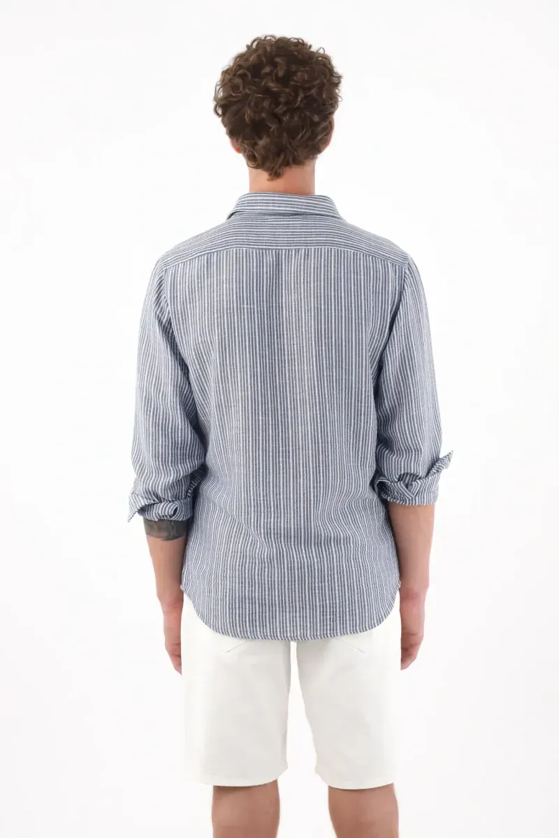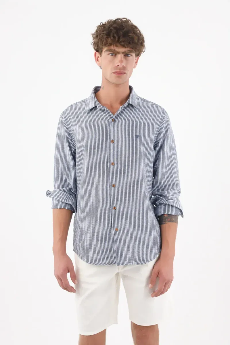 Fit & Styling Llévala con una camisa ligera de rayas azul, mangas remangadas y un medio tuck para afinar la silueta. Resultado: un outfit urbano, fresco y pulcro para moverte entre reuniones, terrazas y paseos de fin de semana.