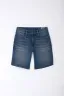 Llévala en su corte recto con una camiseta de algodón blanca metida levemente y una camisa ligera de manga corta en tonos tierra abierta; paleta limpia que resalta el azul de esta bermuda jean azul y mantiene la vibra fresca del día a día.