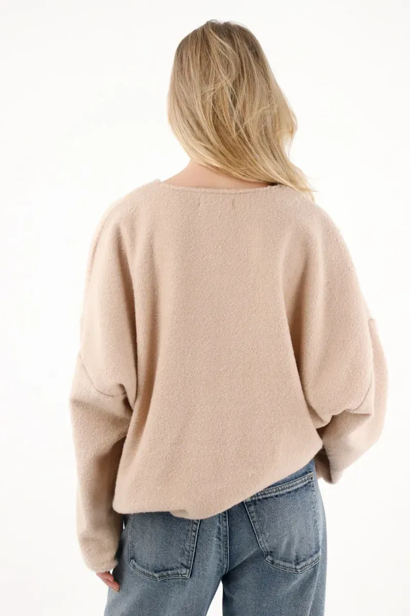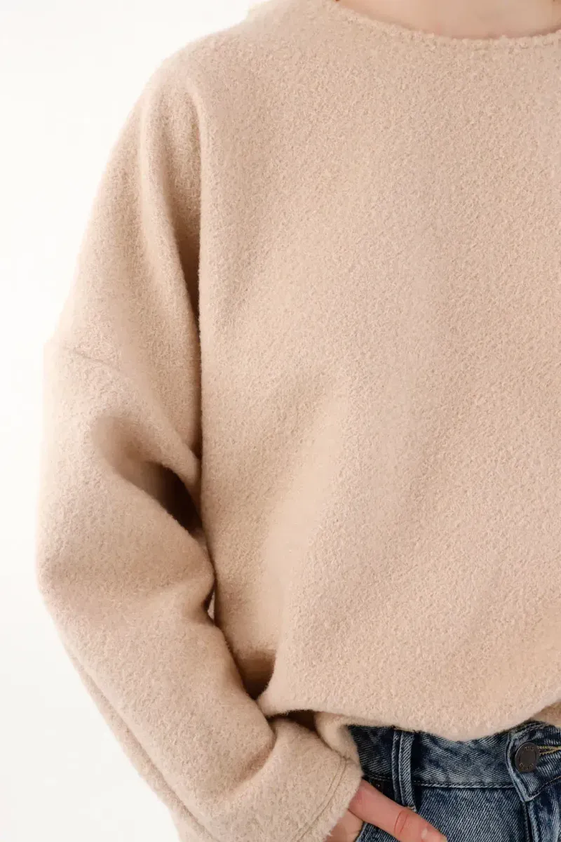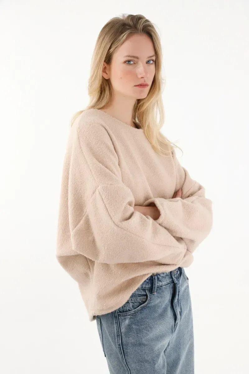 ¡Perfecto para crear looks relajados! Su color latte aporta una vibra cálida y moderna que combina con jeans, pantalones amplios o incluso faldas para un contraste único. La silueta amplia con manga caída crea un efecto relajado y envolvente, ideal para layering con chaquetas protagonistas de la cápsula. Confeccionado en tela suave con textura afelpada, tiene cuello redondo, puños amplios y un fit holgado que aporta comodidad sin perder estructura visual. Sobre la colección: Un básico elevated que se siente como un abrazo y se ve como un statement de buen gusto. Añádelo a tus esenciales de temporada.