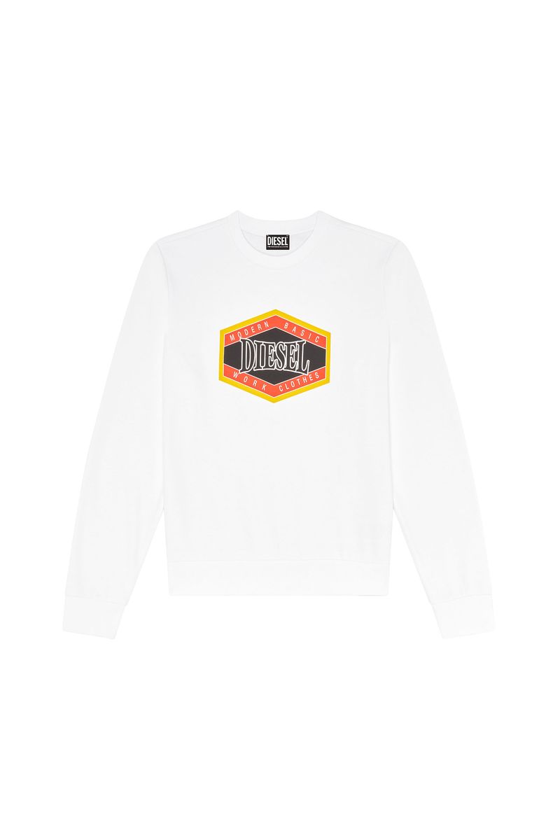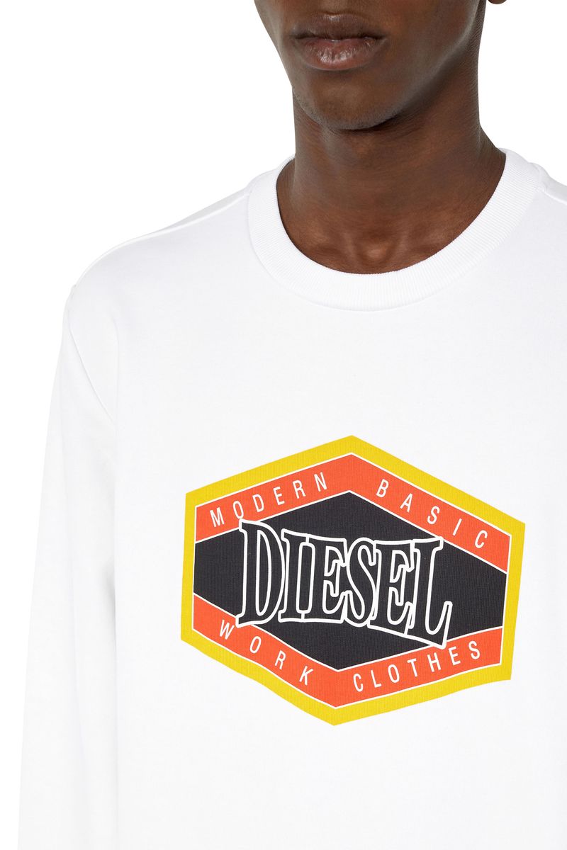Diesel es una innovadora marca internacional de estilo de vida que produce una amplia colección de jeans, ropa y accesorios. Somos pioneros en denim y con el pasar de los años nos convertimos en una marca de ropa casual premium, siendo una verdadera alternativa en el mercado de lujo establecido. Somos una marca que representa la pasión, la individualidad y la autoexpresión. El Mundo DIESEL te espera. Sudadera de corte regular para hombre confeccionada en una mezcla liviana de algodón con forro de bouclé. Tiene ribetes en canalé y un estampado 'Diesel Modern Basic Work Clothes' en el pecho. 60%Algodón 40%Poliéster, Elástico 95%Algodón 5%Elastano País Origen: China El modelo viste una talla L y mide 182 cm