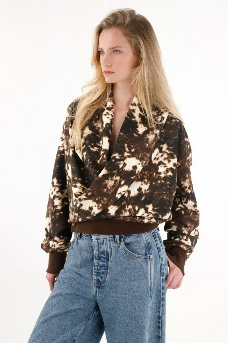 ¡Un buzo amplio, moderno y con muchísima personalidad para transformar tus outfits casuales! Este buzo para mujer está diseñado en una silueta holgada que aporta comodidad y un diseño cruzado perfecto para días fríos o para crear capas con estilo. Su tela burda estampada añade textura y carácter, mientras que el cuello con solapas grandes le da un toque único y muy actual. El diseño de frentes cruzados crea un efecto envolvente favorecedor, complementado por botones decorativos en el fajón que aportan un acabado sofisticado. Además, tanto el fajón como los puños en rib aseguran un ajuste cómodo y firme, manteniendo la estructura de la prenda sin perder su caída relajada. Está elaborado en una mezcla de 98% algodón y 2% elastano, una combinación que garantiza suavidad, calidez, transpirabilidad y un leve estiramiento que mejora el confort y la movilidad. Sobre la colección: Hace parte de nuestra cápsula de prendas auténticas con estampados memorables de temporada, los cuales realzan la aventura, los outfis arriesgados y las prendas que no necesitan de más accesorios para marcar tendencias.