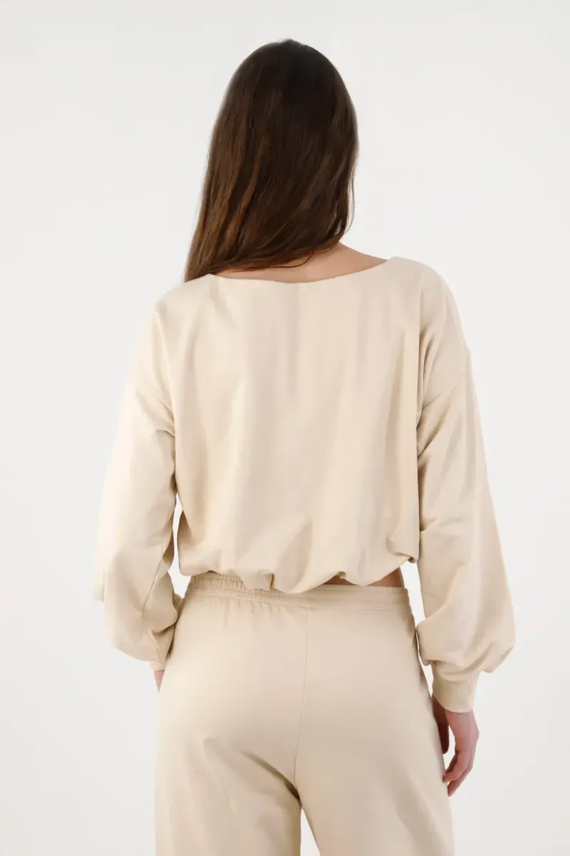 Fit & Styling Llévalo al natural con un jogger de algodón de tiro alto en el mismo tono para un set monocromático. Ajusta el ruedo a la cintura para marcar la silueta y deja las mangas apenas infladas: buzo beige cropped, urbano y listo para tu rutina.