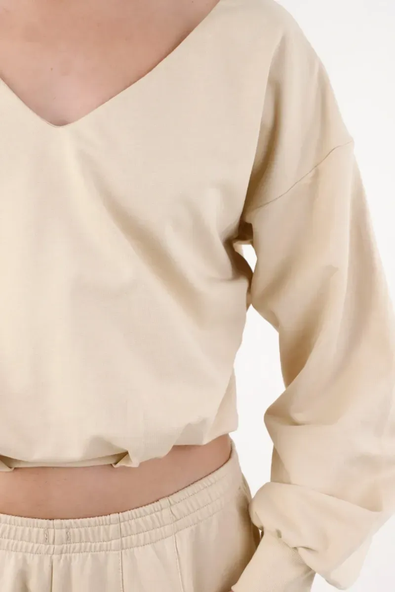 Este buzo de punto entero en algodón 100% se siente ligero y respirable, pensado para moverse contigo en la ciudad. El escote en V, redondeado y limpio, alarga visualmente el cuello y enmarca la clavícula para un efecto sutilmente femenino. El hombro caído y las mangas tipo globo con puños anchos aportan volumen controlado y comodidad real durante todo el día. Su silueta cropped y relajada descansa a la altura de la cintura, perfecta para combinar con tiros altos; el tono beige arena multiplica las combinaciones y mantiene el look minimal que define TNS. Acabados prolijos y cero excesos: un buzo mujer algodón 100 que suma identidad sin esfuerzo.