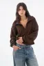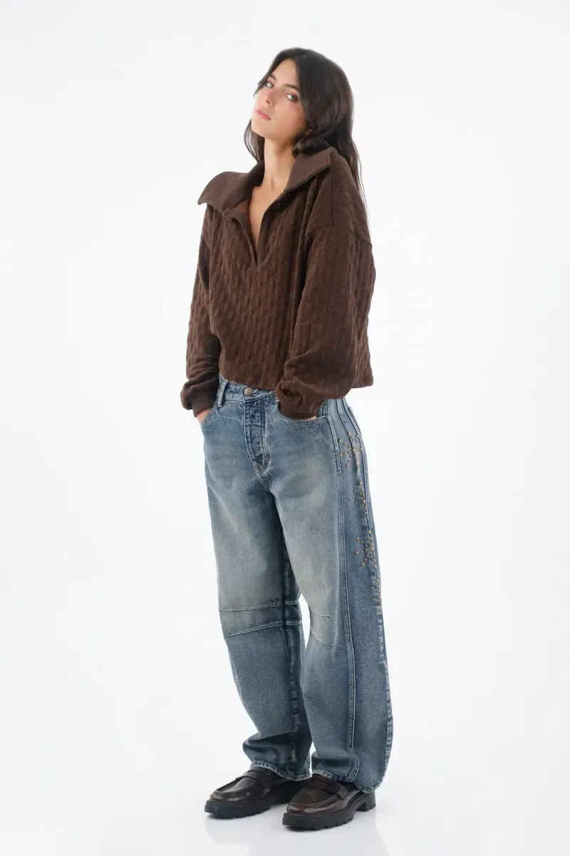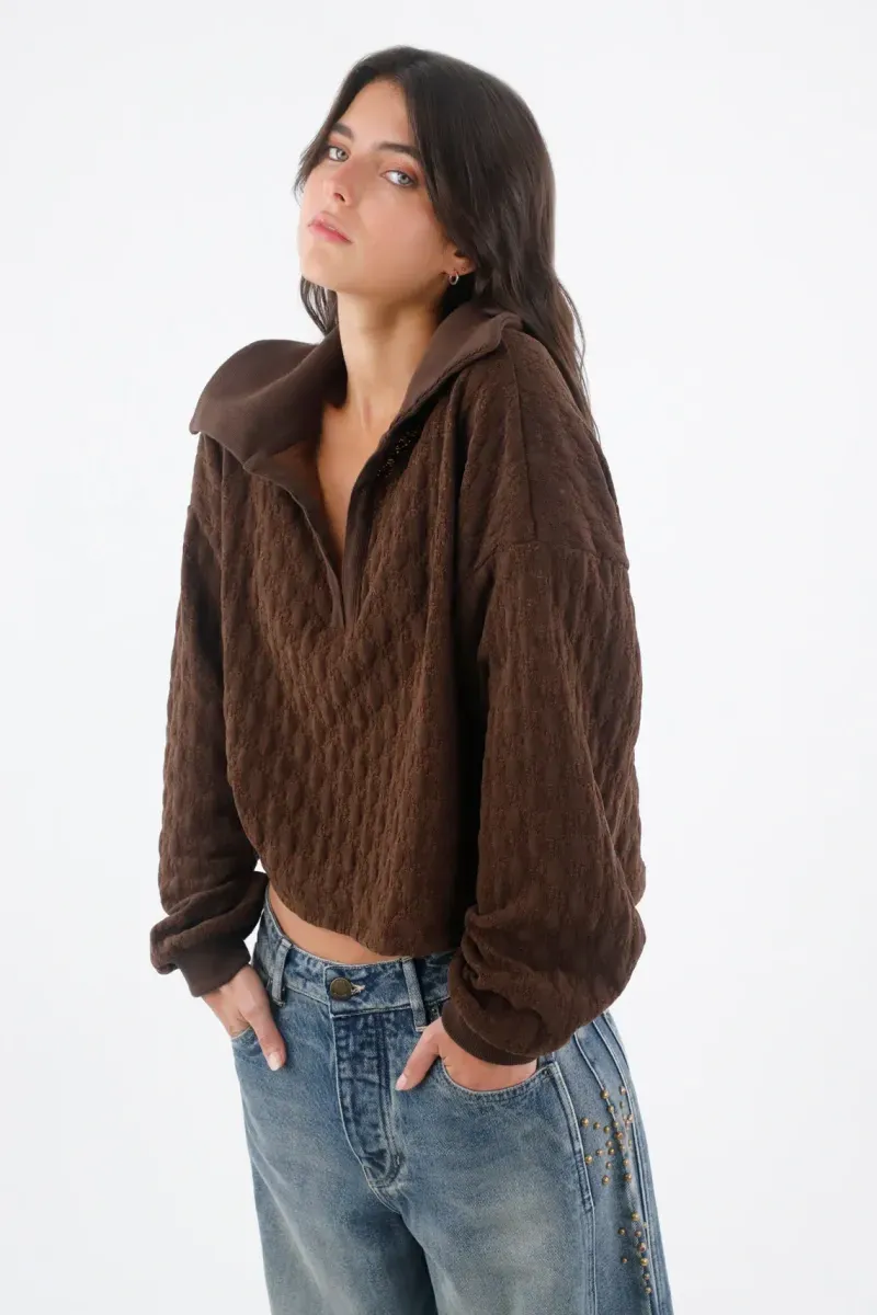El polo que se volvió buzo. Este buzo de punto entero en tono marrón apuesta por la textura: el relieve sutil capta la luz y suma profundidad sin esfuerzo. El cuello polo con escote en V alarga la línea del cuello y aporta actitud urbana. La silueta relajada con hombro caído y mangas amplias mantiene la vibra suelta, mientras los puños acanalados ordenan el volumen. El largo a la cintura crea un efecto ligeramente cropped que favorece los tiros altos. Con tejido que incluye algodón, es una base fácil para el ritmo de la ciudad.