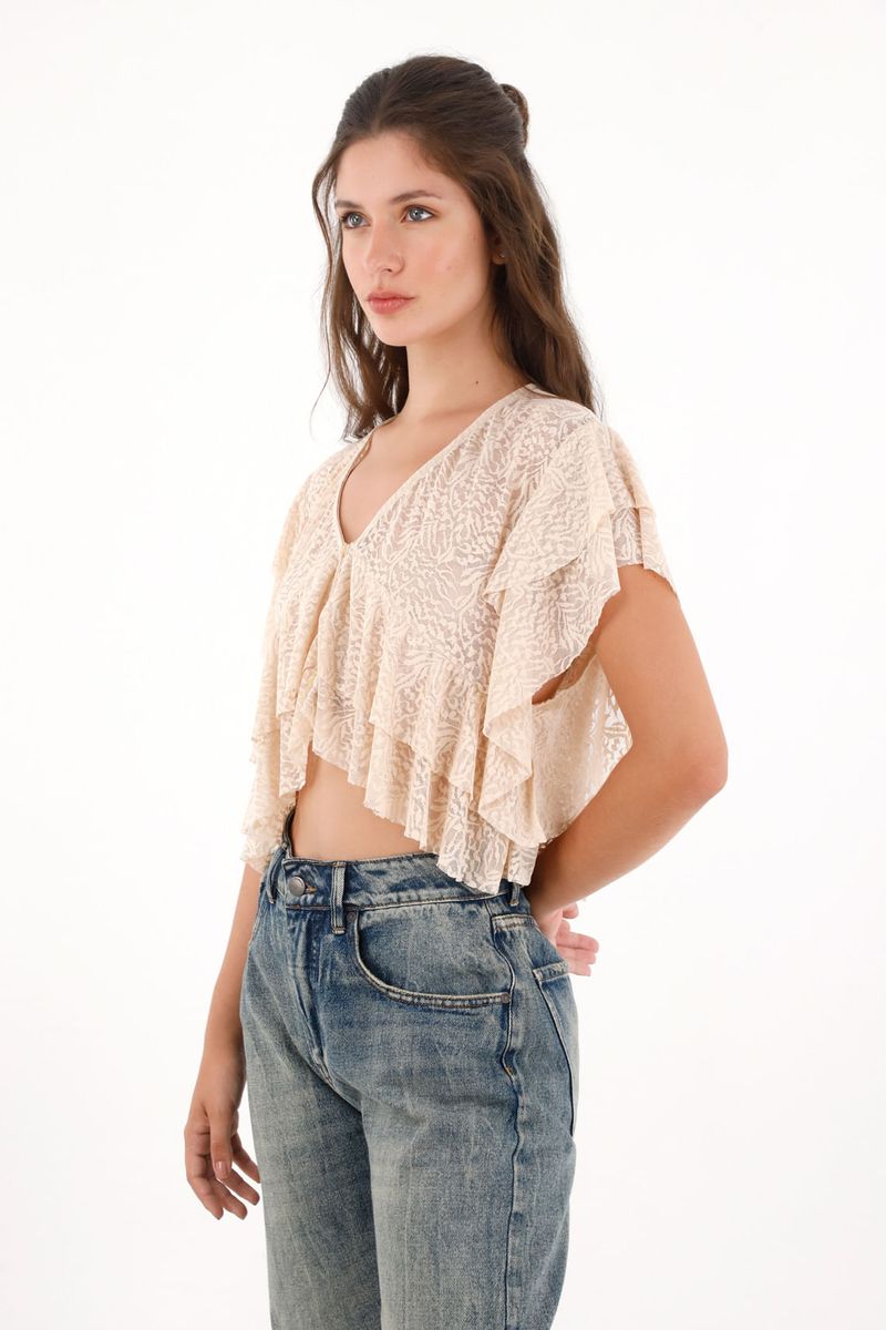 ¡Romántica y en tendencia! Esta camisa crop en tela tipo blonda tiene ese aire femenino y atrevido que eleva cualquier look.