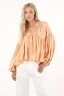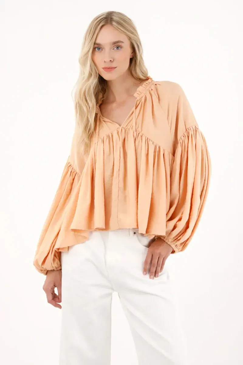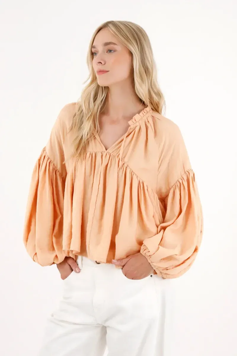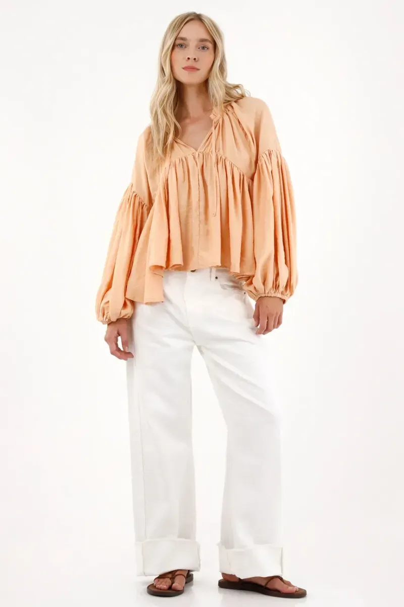 Confeccionada en tela con apariencia lino, ligera y con caída suave, ideal para climas cálidos o para lucir con capas con tus complementos favoritos. Su diseño con escote en V y tiras que anudan, aporta ese aire libre que va perfecto con jeans Wide Leg o faldas de tela fluida. Los cortes con recogido y la manga larga amplia le suman movimiento y volumen, dándole ese twist boho que nunca pasa desapercibido.