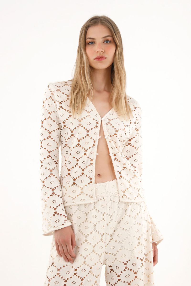 Su silueta cómoda y el tejido de punto con detalles desagujados le dan un aire ligero y femenino, perfecto para un look fresco y delicado.