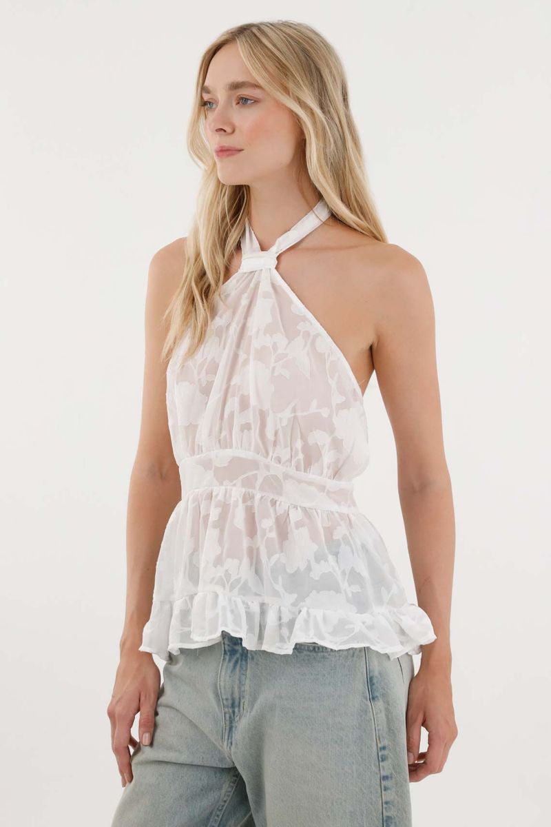 Hecho en tela chifón, ligera y translúcida, que suma elegancia y movimiento a cada paso. El cuello halter y los cortes en frente estilizan la figura, mientras que el bolero en ruedo le agrega ese vibe femenino que tanto disfrutas. Perfecta para combinar con pantalones de silueta ajustada o faldas midi en un plan de tarde-noche.