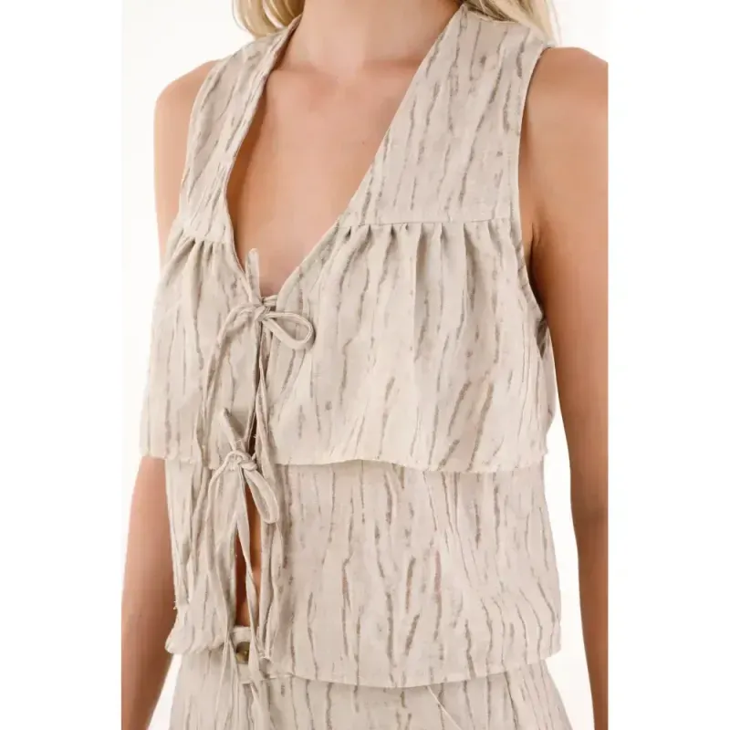 Con una silueta tipo chaleco y tiras que se anudan al frente, esta camisa captura la esencia del verano: liviana, relajada y con un aire romántico que se adapta a cualquier ocasión. Perfecta para usar en set con su short a juego o combinar con denim de tiro alto para lograr un look casual con un toque chic.