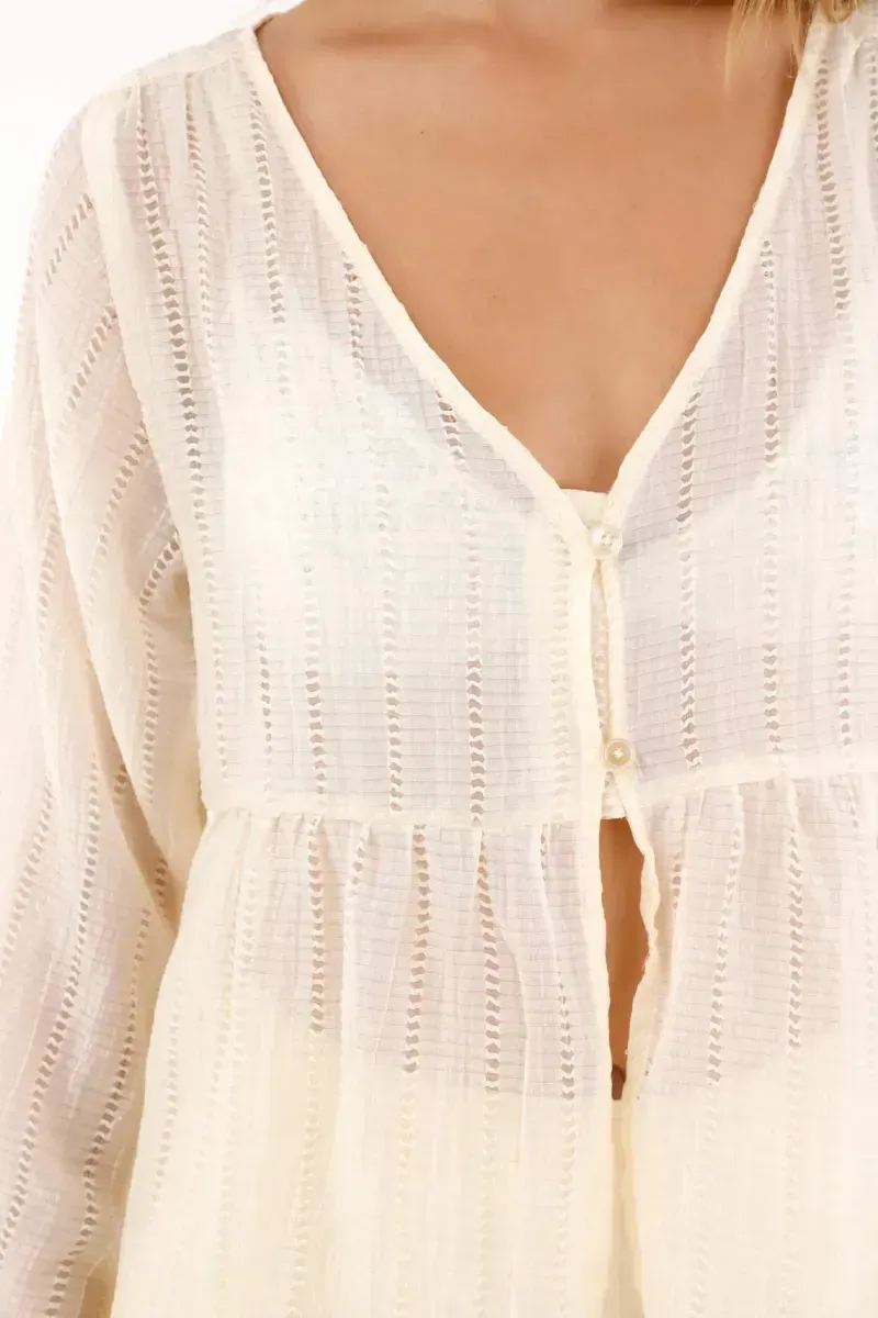 Su silueta amplia se mueve con soltura, mientras el escote en V y el ajuste con botones aportan un toque delicado y femenino.