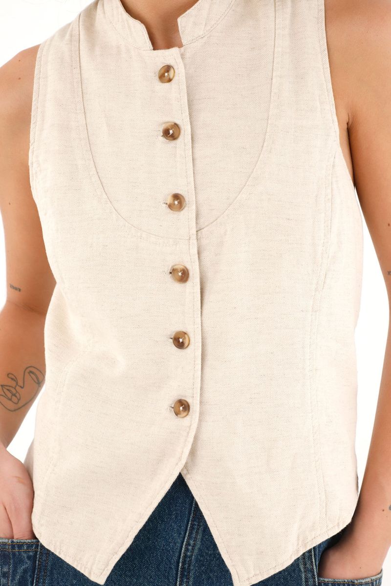 ¡Sofisticación en cada detalle! Este top sin mangas con cuello neru es una pieza llena de carácter y estilo sutil.