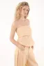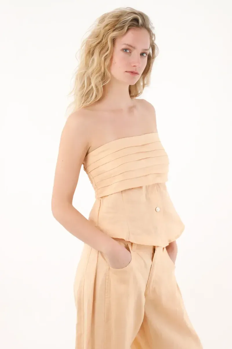 Esta camisa strapless para mujer combina una silueta semi ajustada con detalles cuidadosamente construidos que la convierten en una pieza especial. Su parte superior cuenta con delicadas tablas que aportan estructura y un aire sofisticado, mientras que la parte inferior incluye una perilla con botón que genera un acabado limpio y favorecedor. La silueta brinda libertad de movimiento y un fit femenino, ideal para looks relajados o más formales. La espalda incorpora un nido de abeja que ofrece un ajuste cómodo, flexible y seguro, manteniendo la prenda firme sin sacrificar confort. Al ser corta, es perfecta para combinar con prendas de tiro alto o con su short en set.