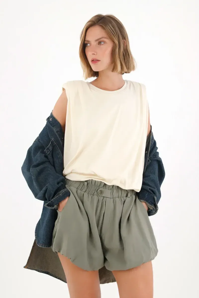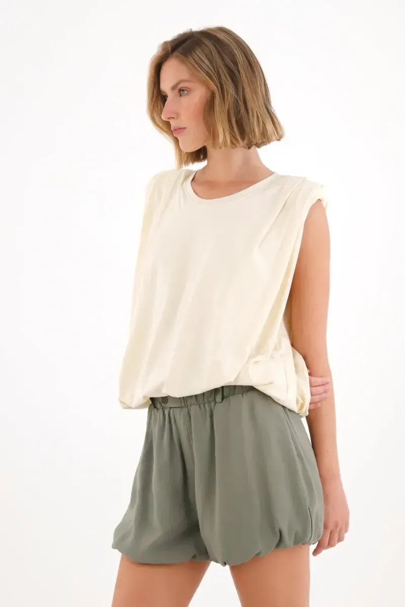 ¡Perfecta para elevar desde un look casual hasta uno más sofisticado! Esta camiseta reinventa lo esencial con hombreras y drapeado en los hombros que le dan un aire estructurado y moderno.