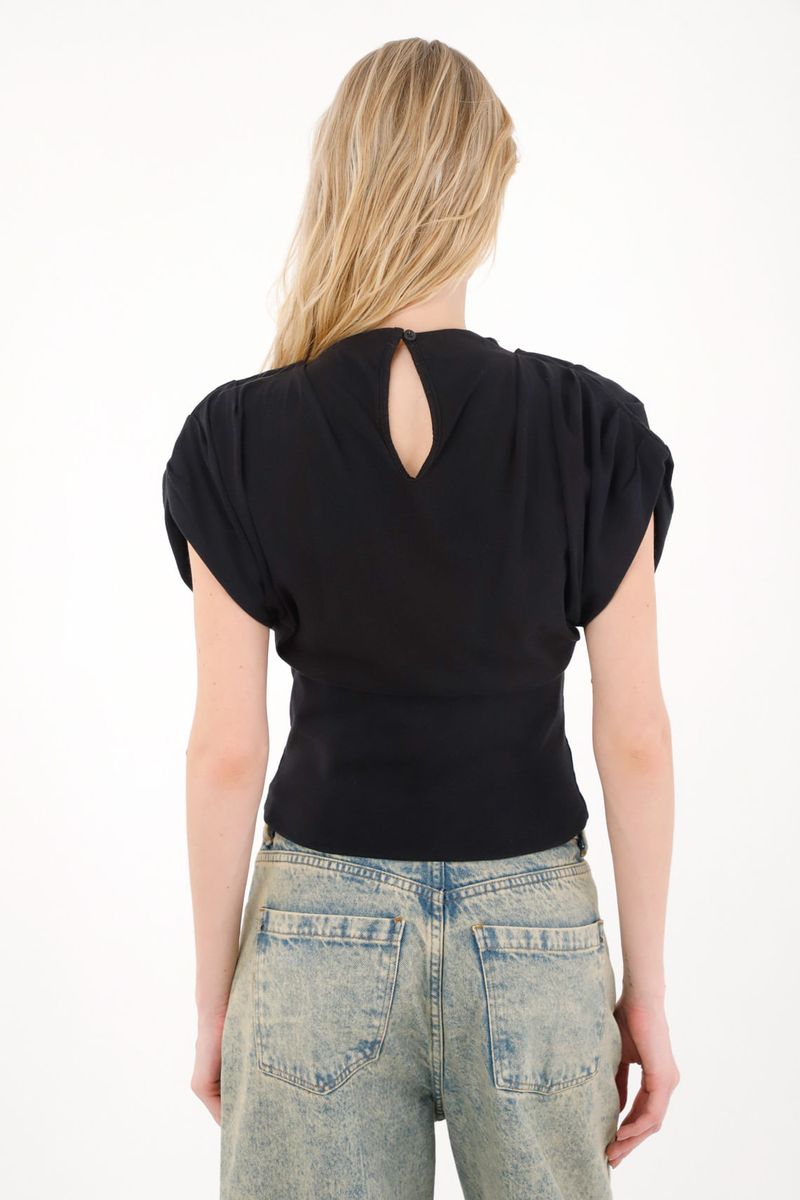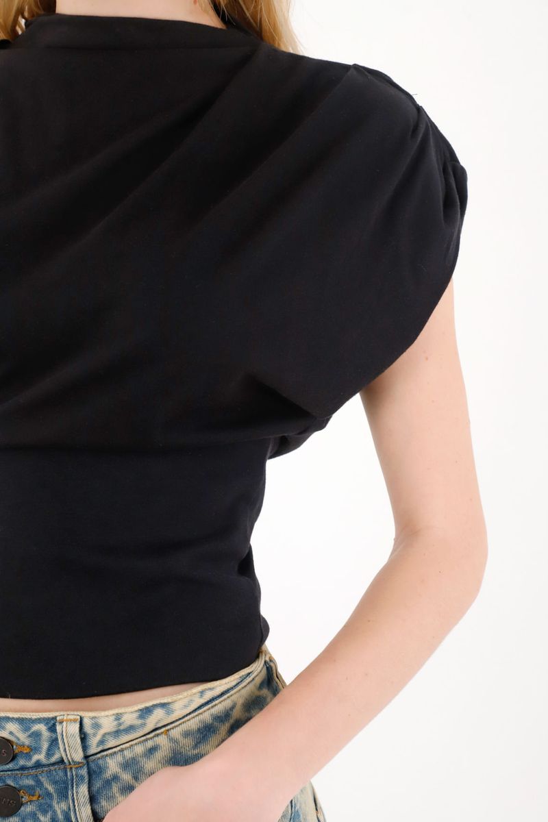 ¡Minimalista, actual y versátil! Esta camiseta con drapeado en los hombros y fajón en la base le da un upgrade instantáneo a tu look diario.