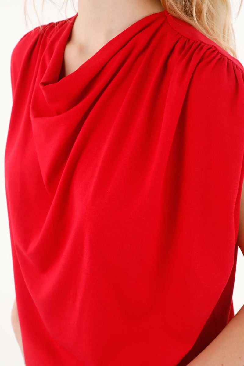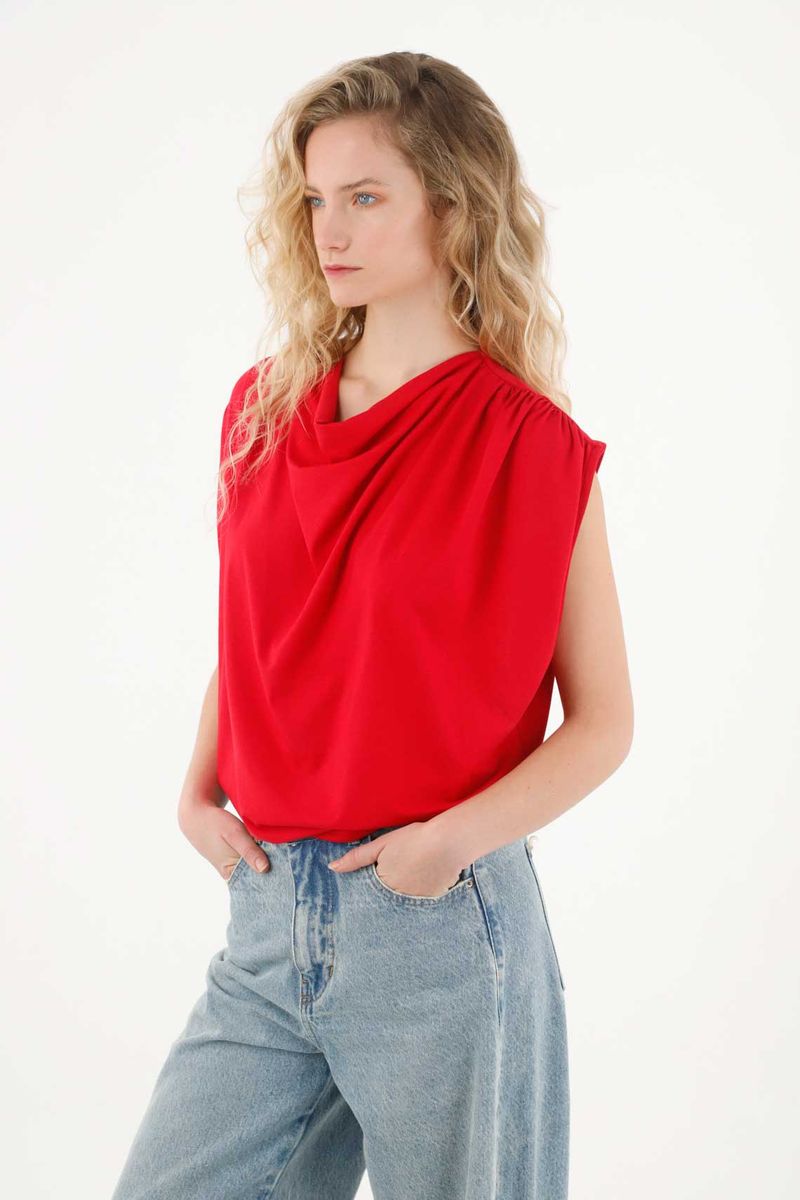 Esta tshirt manga sisa está confeccionada en una tela de tacto frío que se adapta delicadamente a tu cuerpo, brindando una sensación ligera, suave y muy agradable para los días cálidos o para looks casuales con un toque moderno. Su escote drapeado aporta un detalle femenino que estiliza, realza y suma un aire sofisticado sin esfuerzo.