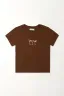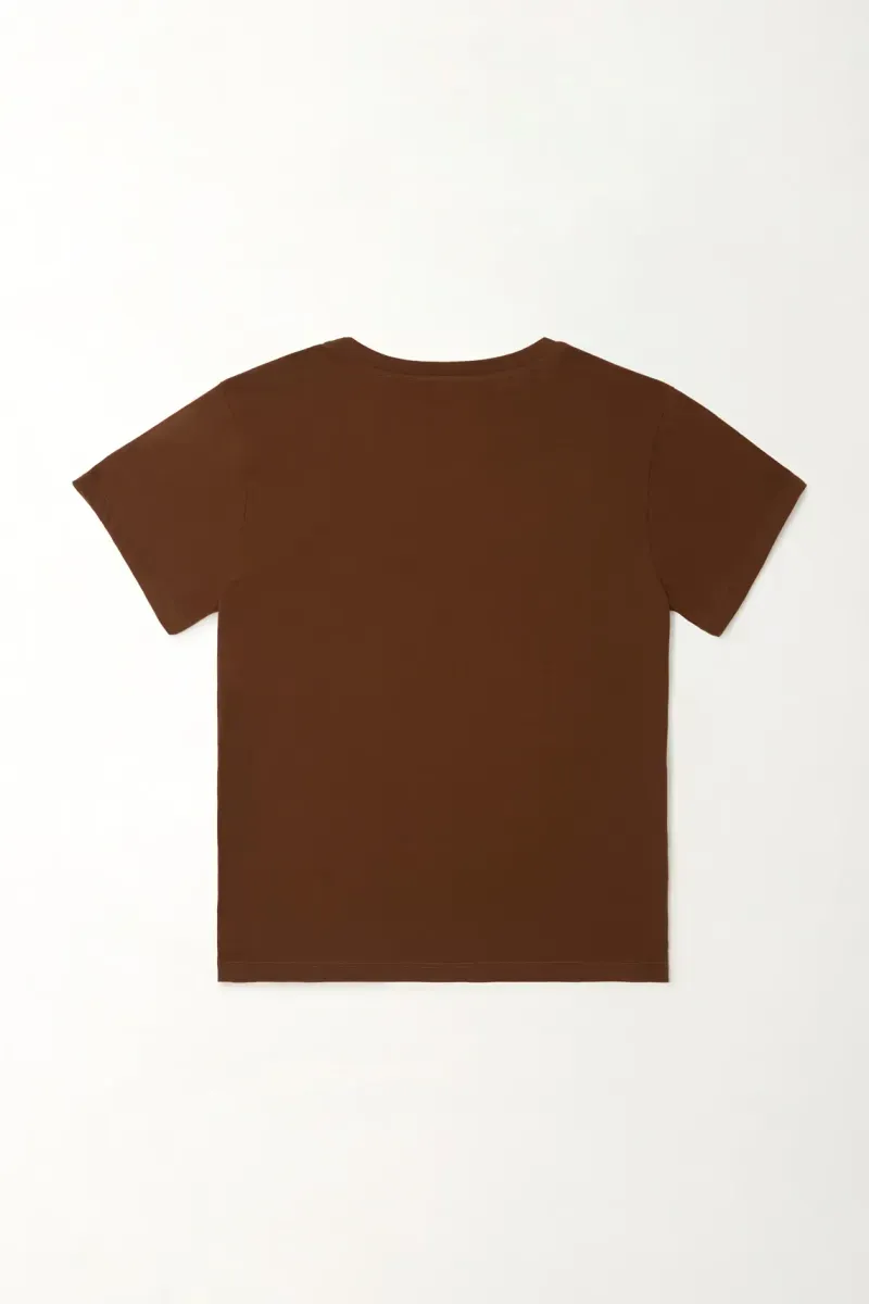 Esta camiseta de manga corta combina simplicidad y estilo en una silueta clásica que nunca falla. Su cuello redondo y su corte cómodo la convierten en una prenda versátil para usar con jeans, shorts o pantalones relajados. El estampado localizado aporta un toque moderno que eleva cualquier outfit sin perder la esencia minimalista.