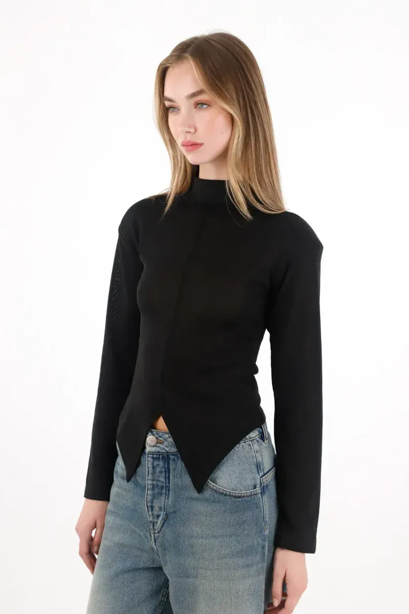 Con cuello tortuga, manga larga y un corte delantero que enmarca la silueta, esta camisa ofrece un fit semiajustado que resalta sin limitar. Una tela suave que aporta comodidad y un acabado pulido perfecto para vestir de día o elevar por la noche.