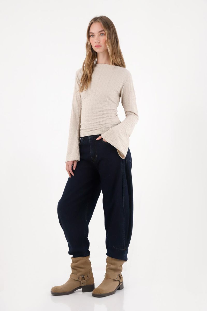 Hecha en tela de punto con textura suave al tacto, de manga larga y escote amplio que equilibra comodidad con estilo. Los puños tipo campana le dan ese detalle especial que hace la diferencia.