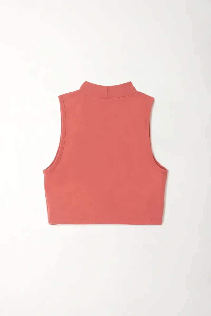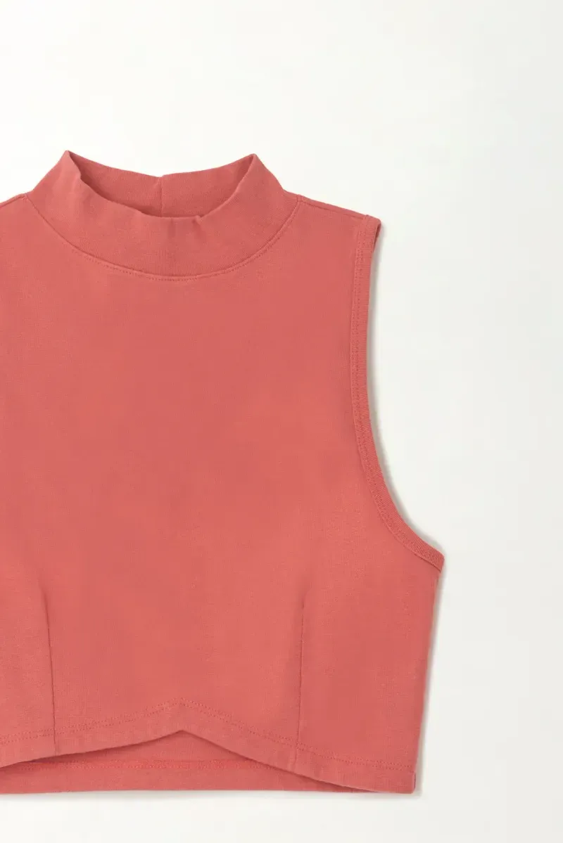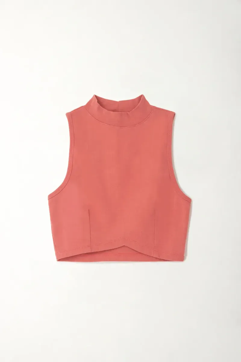 El cuello alto y la manga sisa equilibran estructura y frescura, creando una pieza versátil que se adapta tanto a conjuntos relajados como a combinaciones más elevadas.