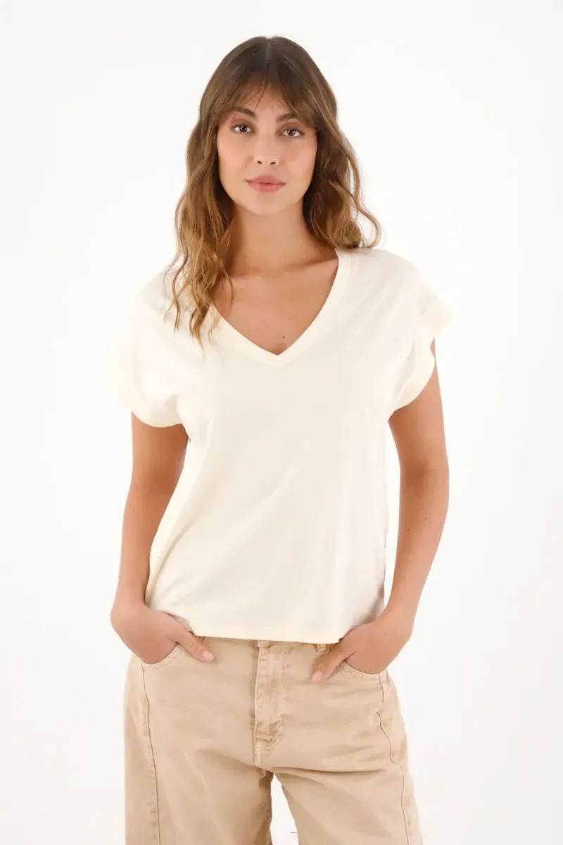 Hecha en algodón 100% liviano, con tacto suave y textura que deja respirar la piel. Una básica que no busca llamar la atención, pero lo logra por su autenticidad.