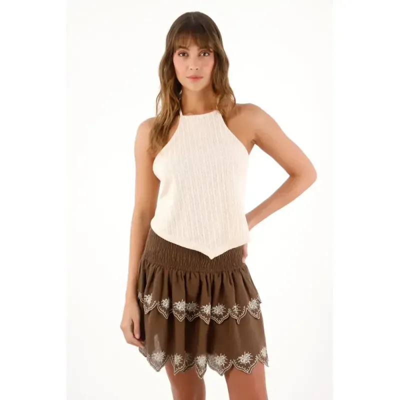 Diseño con cuello halter, tiras que anudan en cuello y confección tejida artesanal.