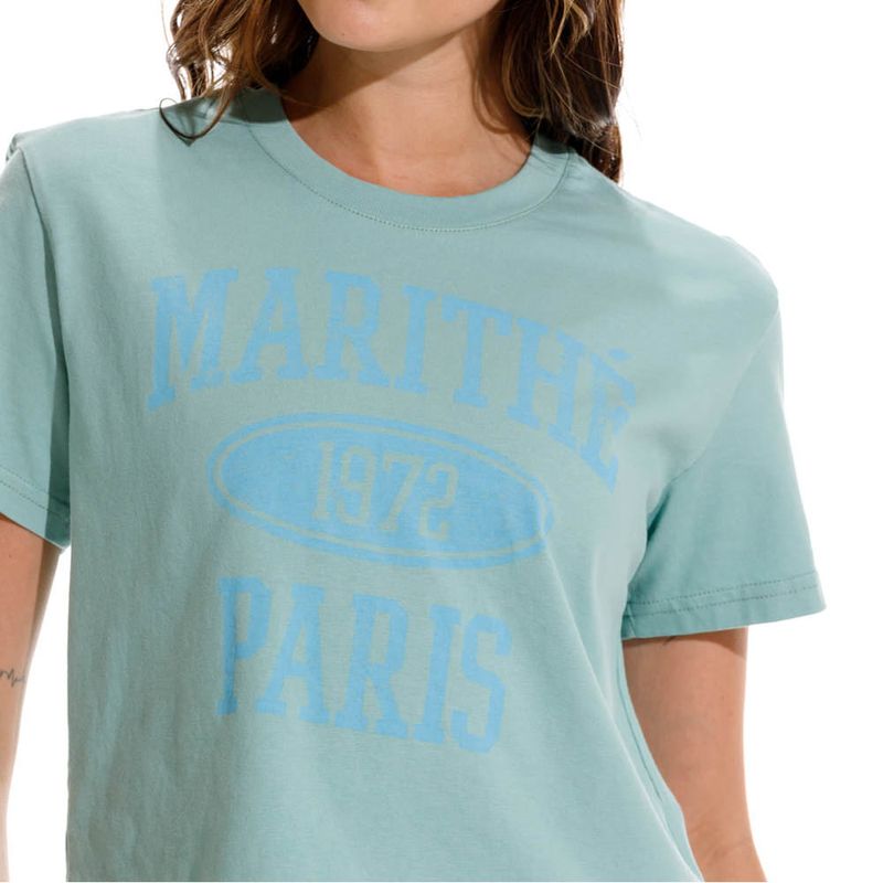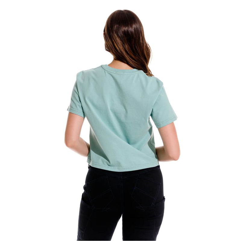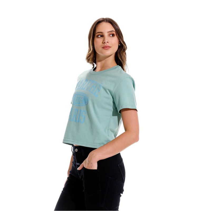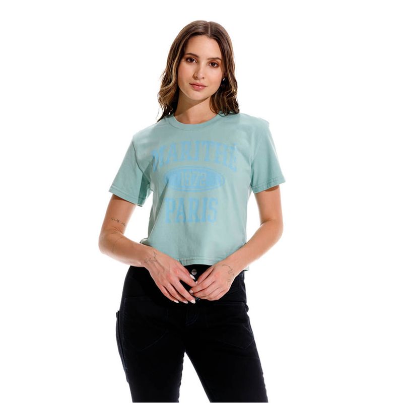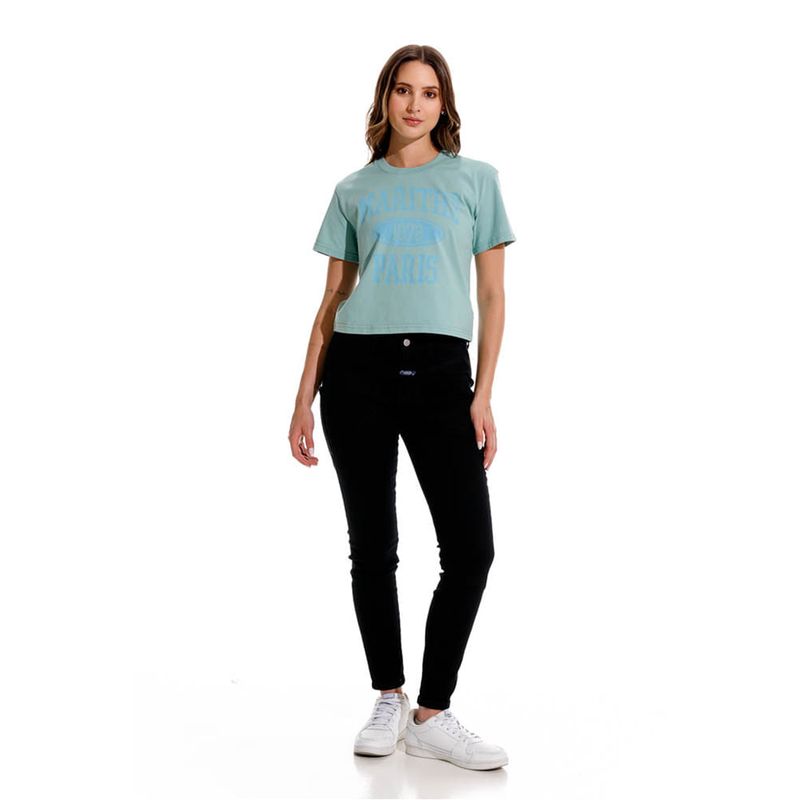 Camiseta Manga Corta Para Mujer Lueur Girbaud, La modelo mide entre 1.70 y 1.75, la prenda superior es talla s y la prenda inferior es talla 6.