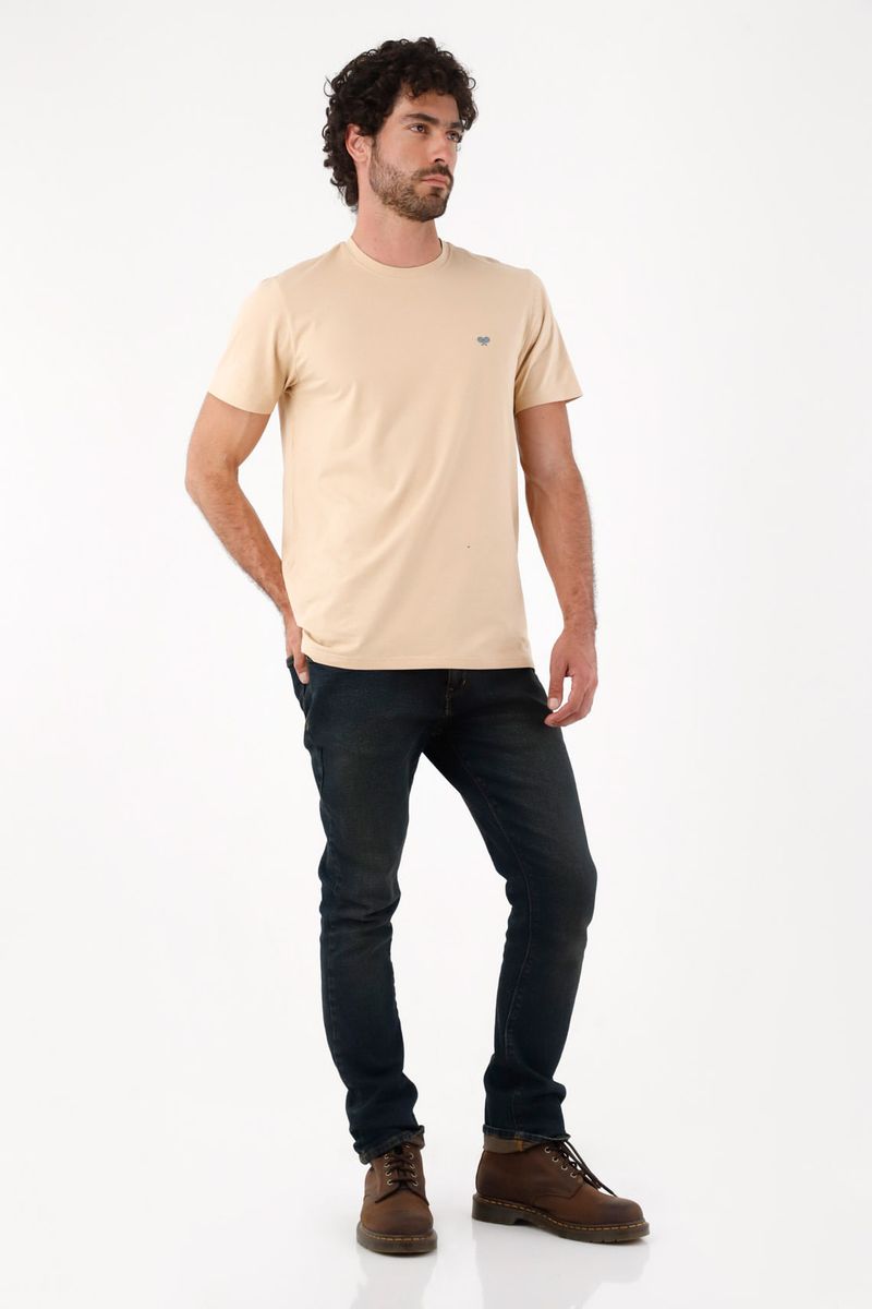 Una camiseta esencial limpia en tono beige arena donde el protagonista es el detalle: un pequeño bordado azul al pecho que suma carácter deportivo urbano sin gritarlo. El algodón 95% con 5% elastano acompaña el movimiento y se siente cómodo todo el día. El corte recto y fit clásico caen prolijos, creando una silueta relajada fácil de combinar. El cuello redondo acanalado y las costuras tonales mantienen el look minimal, mientras el bajo ligeramente curvo suaviza la línea y aporta fluidez.