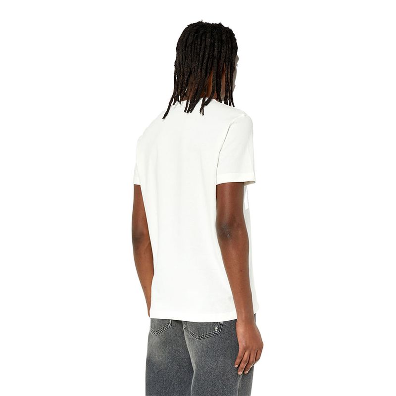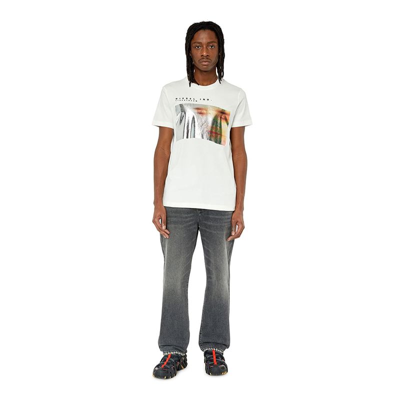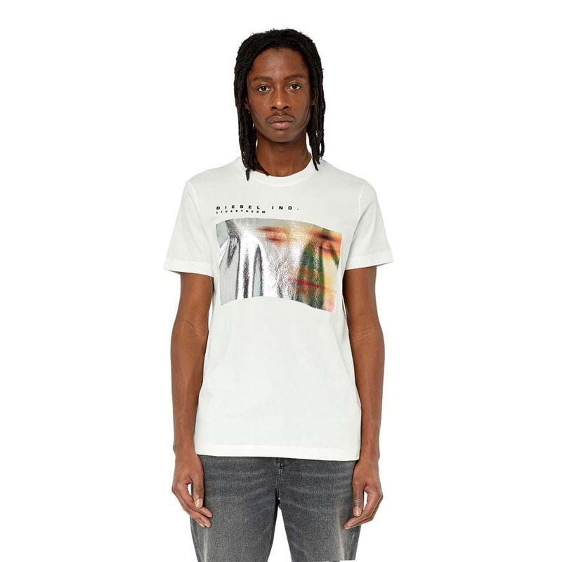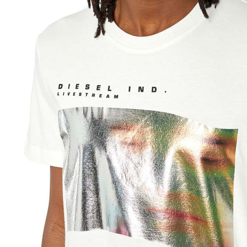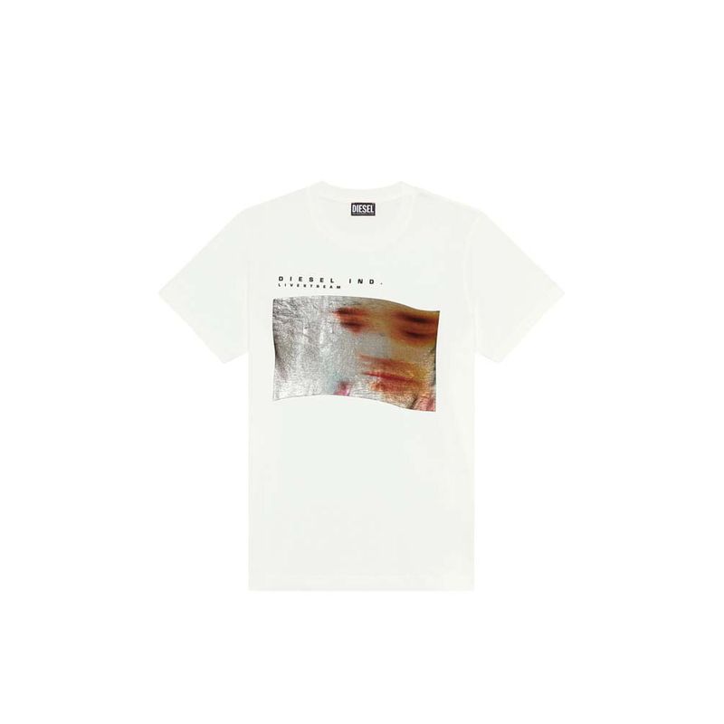 Camiseta entallada para hombre de tejido de algodón. Este modelo con gráfico muestra una fotografía de una cara borrosa estampada en una lámina plateada; el diseño está firmado con las palabras ‘Diesel Ind. Livestream’. El modelo viste una talla L y mide 182 cm 100%Algodón País origen: Vietnam