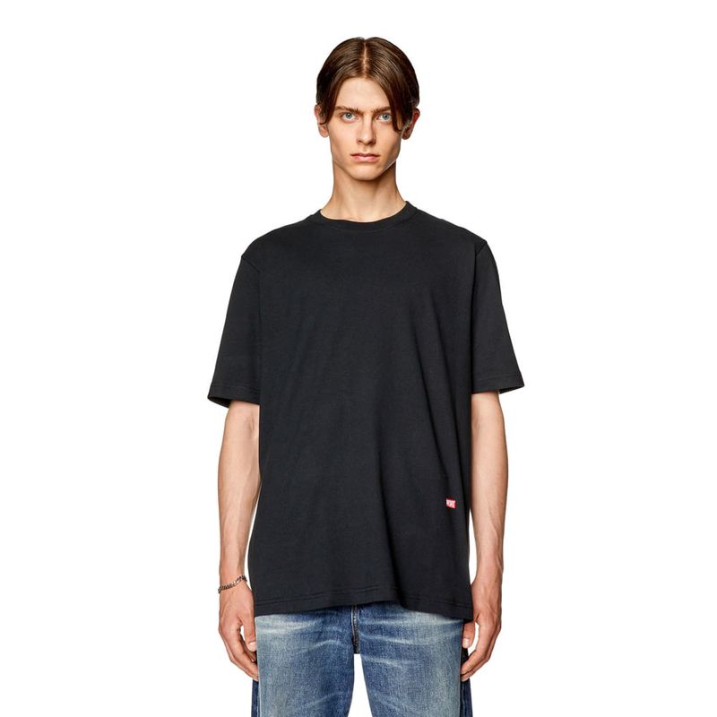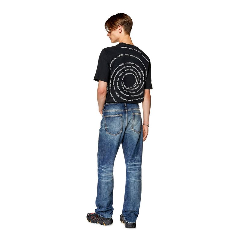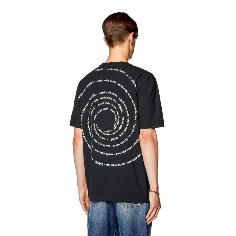 Esta camiseta de fit regular para hombre está hecha de tejido de algodón de efecto crudo. Las palabras Diesel 'World Wide’ en espiral están estampadas en relieve en la parte trasera, mientras que una transferencia de etiqueta Diesel adorna la parte delantera. Está teñido en prenda para lograr un aspecto desteñido. Corte regular