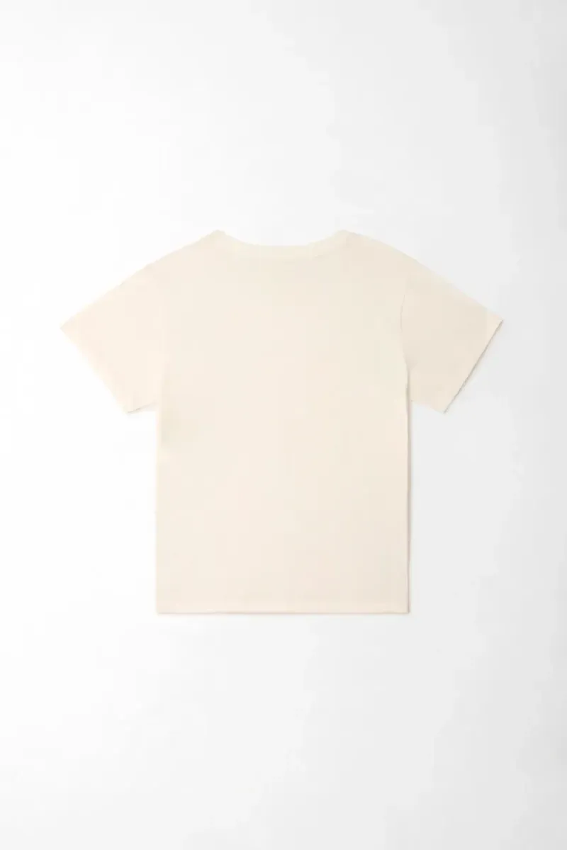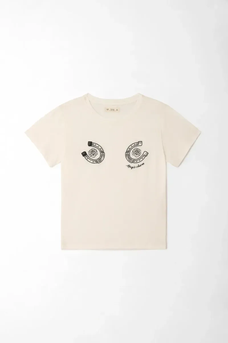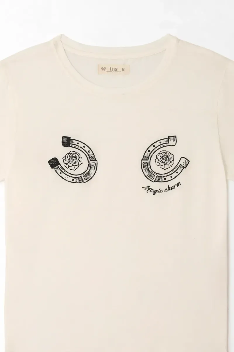 Suerte a primera vista. Una camiseta cruda que convierte un básico en talismán urbano: dos mini estampados delanteros tipo herradura y rosa hacen un guiño sutil y equilibrado, justo donde miras primero. Tejida en algodón 100% de tacto suave, respira contigo y acompaña días largos sin perder forma. El corte clásico y el cuello redondo limpian el look, mientras el largo a la cadera facilita llevarla por dentro o por fuera. El color crudo aporta calidez y combina con todo, dejando que el gráfico y el mensaje “Magic charm” hablen por ti.