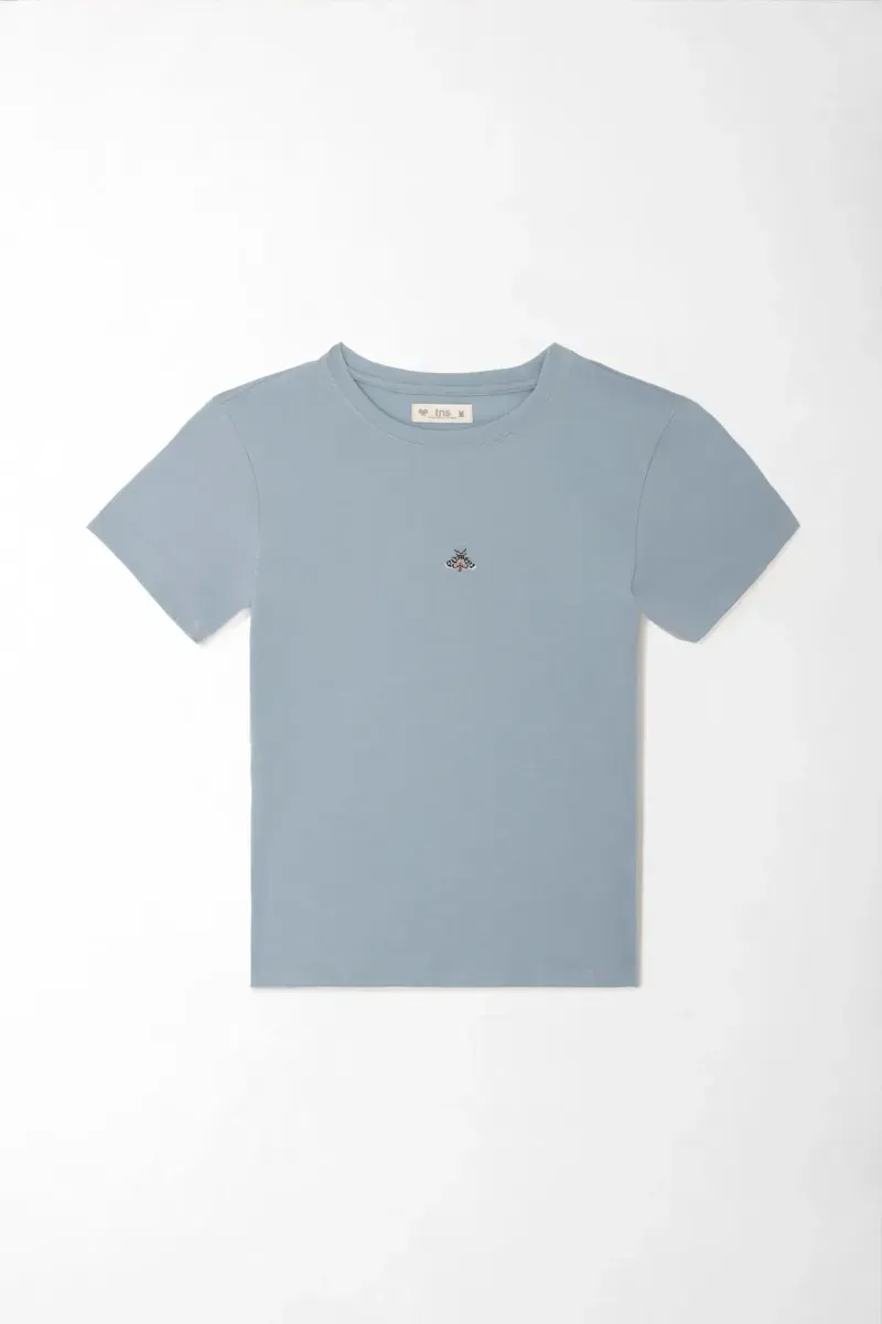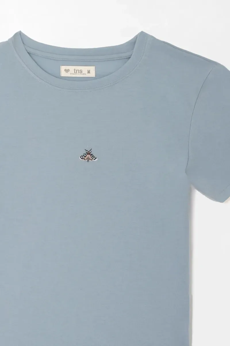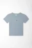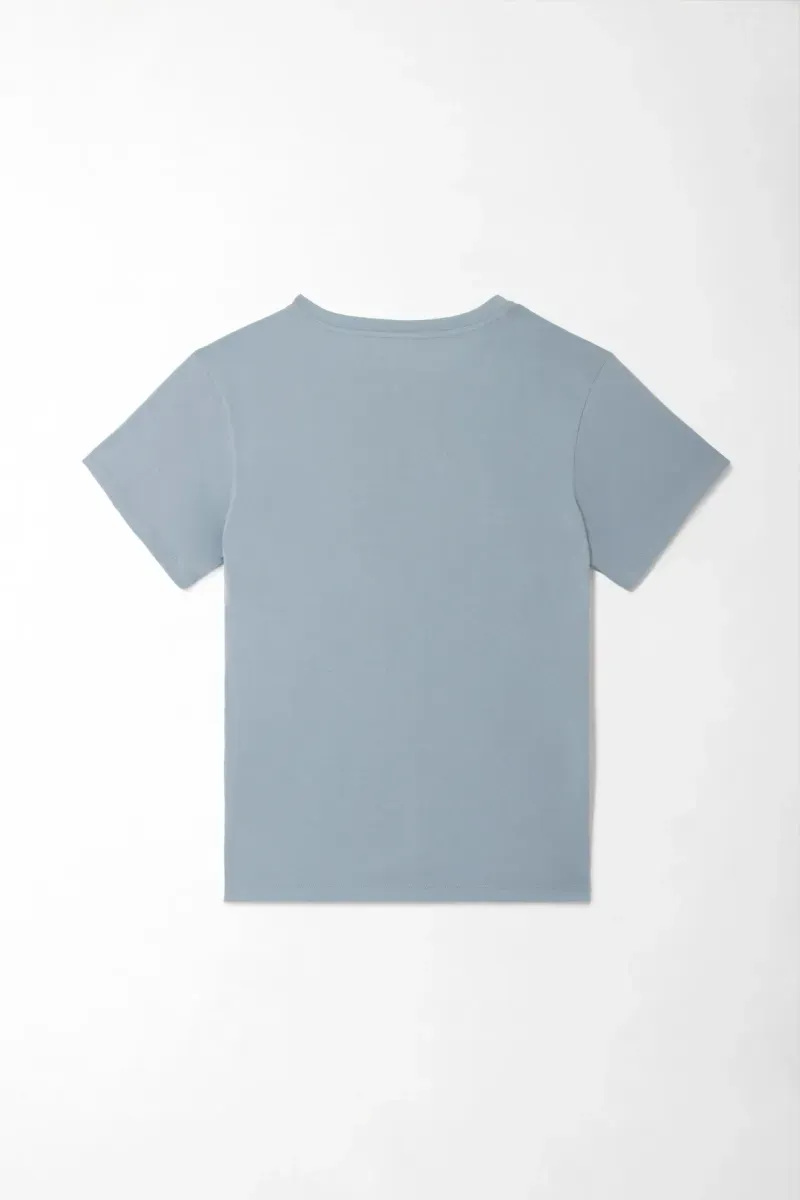 Pequeño bordado, gran actitud. Esta camiseta esencial básica en azul grisáceo apuesta por el minimalismo con un guiño de personalidad. El micro bordado centrado suma identidad sin saturar, para que el look hable por vos. El cuello redondo acanalado mantiene una línea prolija y equilibrada alrededor del rostro. Su punto liso en mezcla de algodón y poliéster luce uniforme y limpio, ideal para llevar todos los días. Las mangas cortas y el dobladillo recto crean un fit clásico y cómodo que funciona en cualquier plan urbano.
