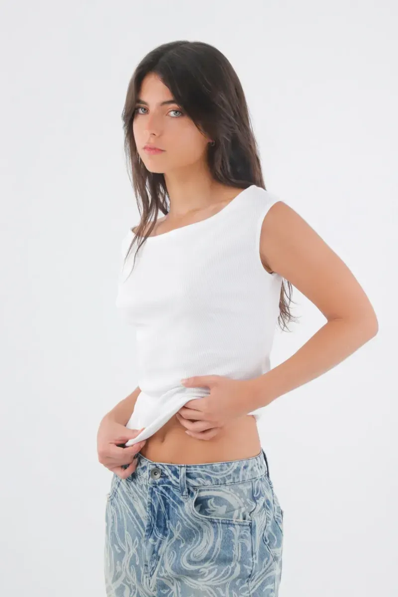 Hombros a la vista, actitud al instante. Esta camiseta blanca reinterpreta lo esencial con un escote tipo barco que cae sutil y deja los hombros al descubierto: una camiseta hombros descubiertos para mujer que respira ciudad. El tejido acanalado en algodón 93% y elastano 7% crea un fit ajustado que acompaña el movimiento y perfila la silueta. El blanco nítido multiplica combinaciones y el largo a la cadera permite usarla por dentro o al natural. Una camiseta algodón blanco con aire limpio y contemporáneo.