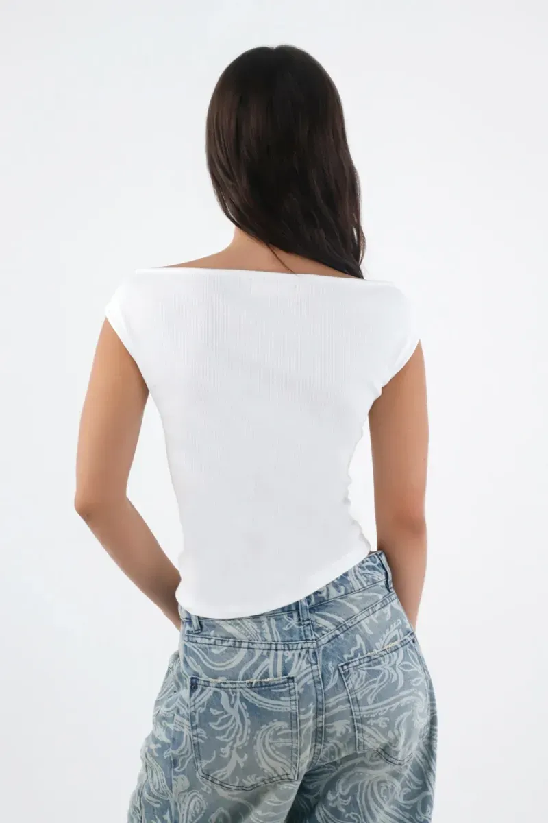 Camiseta para mujer en algodón blanco ajustada con hombros descubiertos