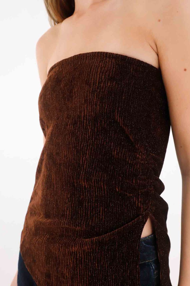 RopaMujerCamisetasCamiseta strapless en tela tipo velvet café para mujer