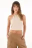 En tela con textura tipo crunch, escotado en posterior, ajuste halter con tiras y canal recogido en cuello.