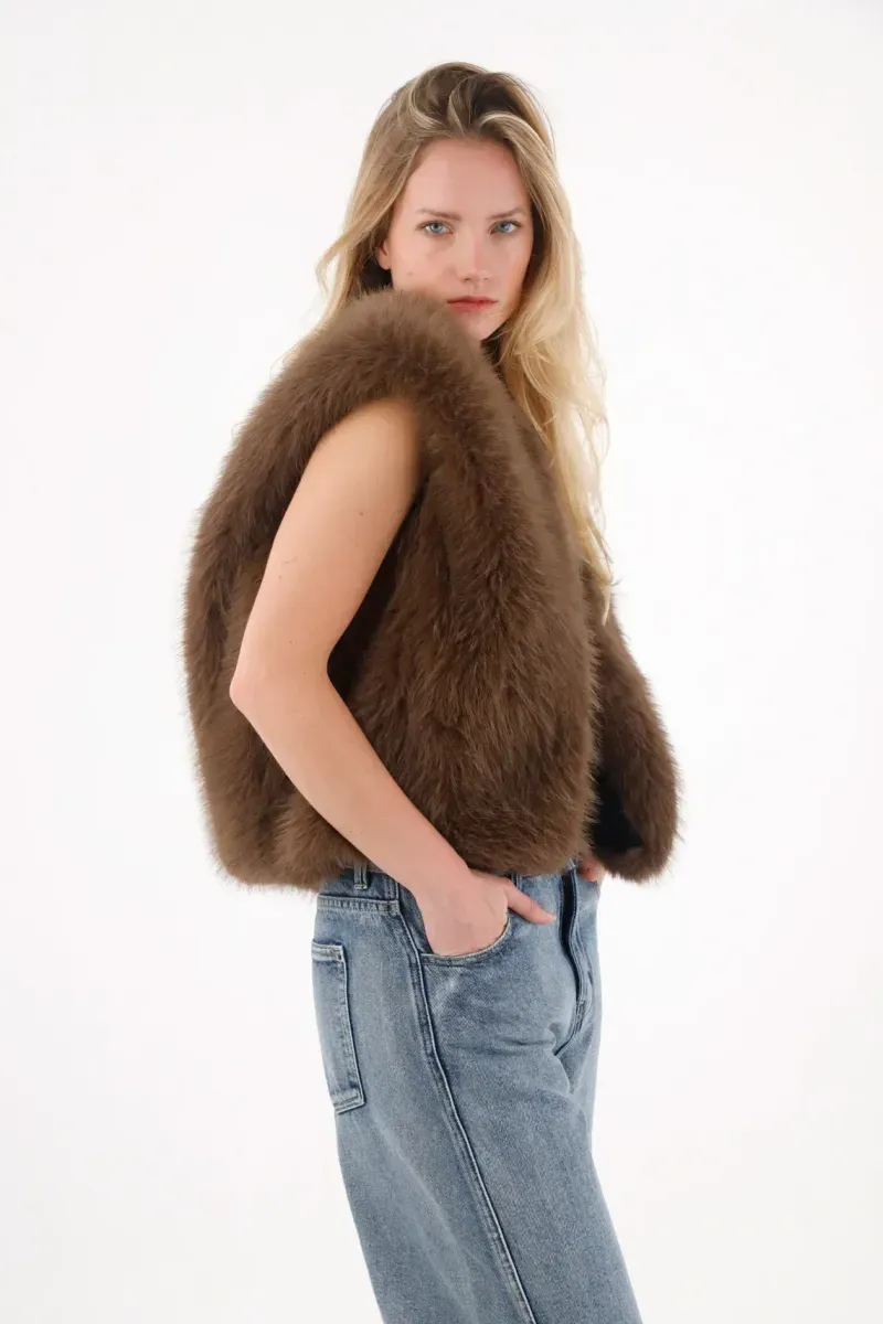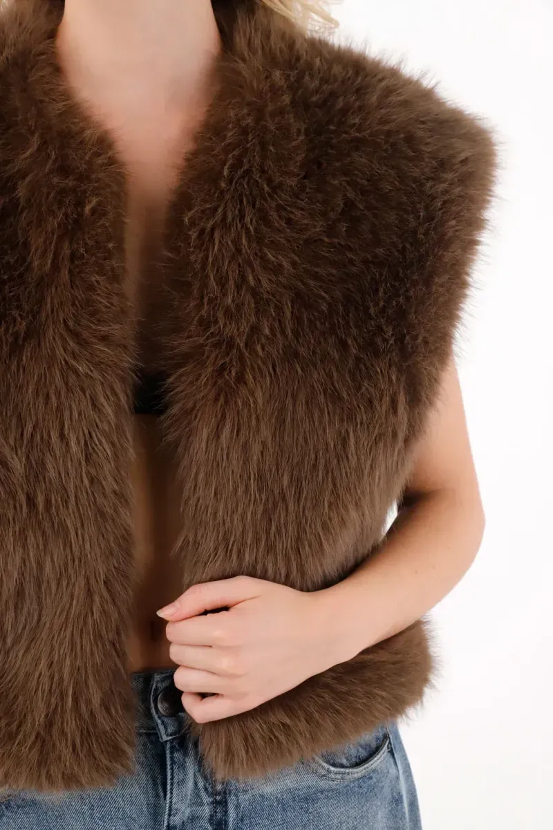 Este chaleco afelpado y corto es perfecto para sumar textura y calidez sin perder ligereza. Su diseño abierto en el delantero lo convierte en una pieza versátil y fácil de combinar, ideal para llevar sobre camisetas, blusas o vestidos cuando buscas un toque extra de estilo sin recargar tu outfit.