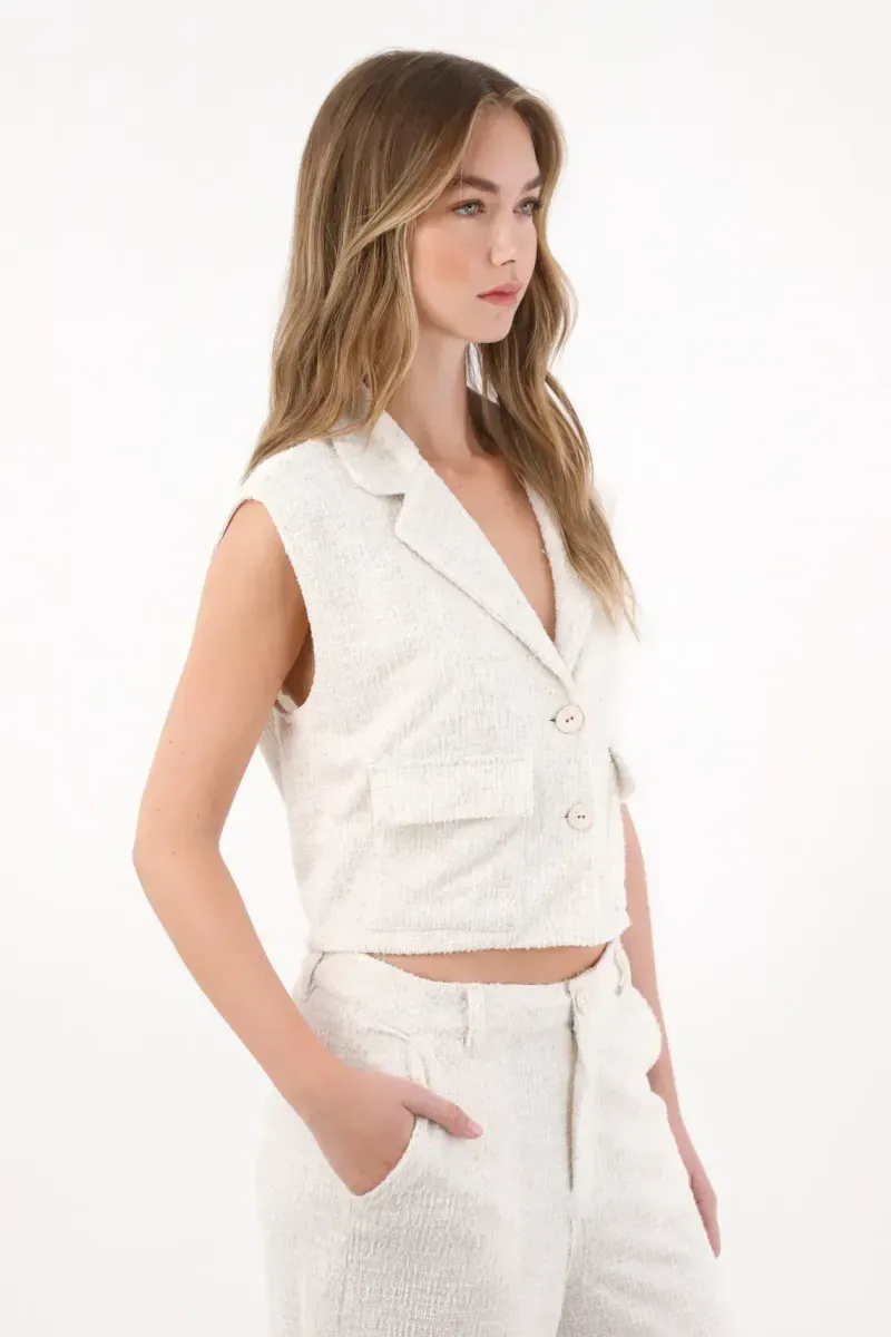Este chaleco en tweed evoca el encanto atemporal del estilo clásico, pero con una actitud contemporánea que lo vuelve irresistible. Su textura rica y estructurada aporta sofisticación al instante, ideal para elevar cualquier look: llévalo sobre una camisa clásica para un aire preppy o combínalo con denim para un contraste casual y chic.