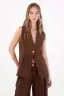 Este chaleco en tela plana semi liviana redefine la elegancia casual con un aire moderno y sofisticado. Su escote en V y silueta larga estilizan la figura, mientras que el frente y la espalda cruzada le suman estructura y movimiento. Ideal para llevar sobre camisetas básicas o tops ajustados, creando looks que se sienten effortlessly chic tanto en la oficina como fuera de ella.
