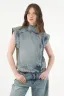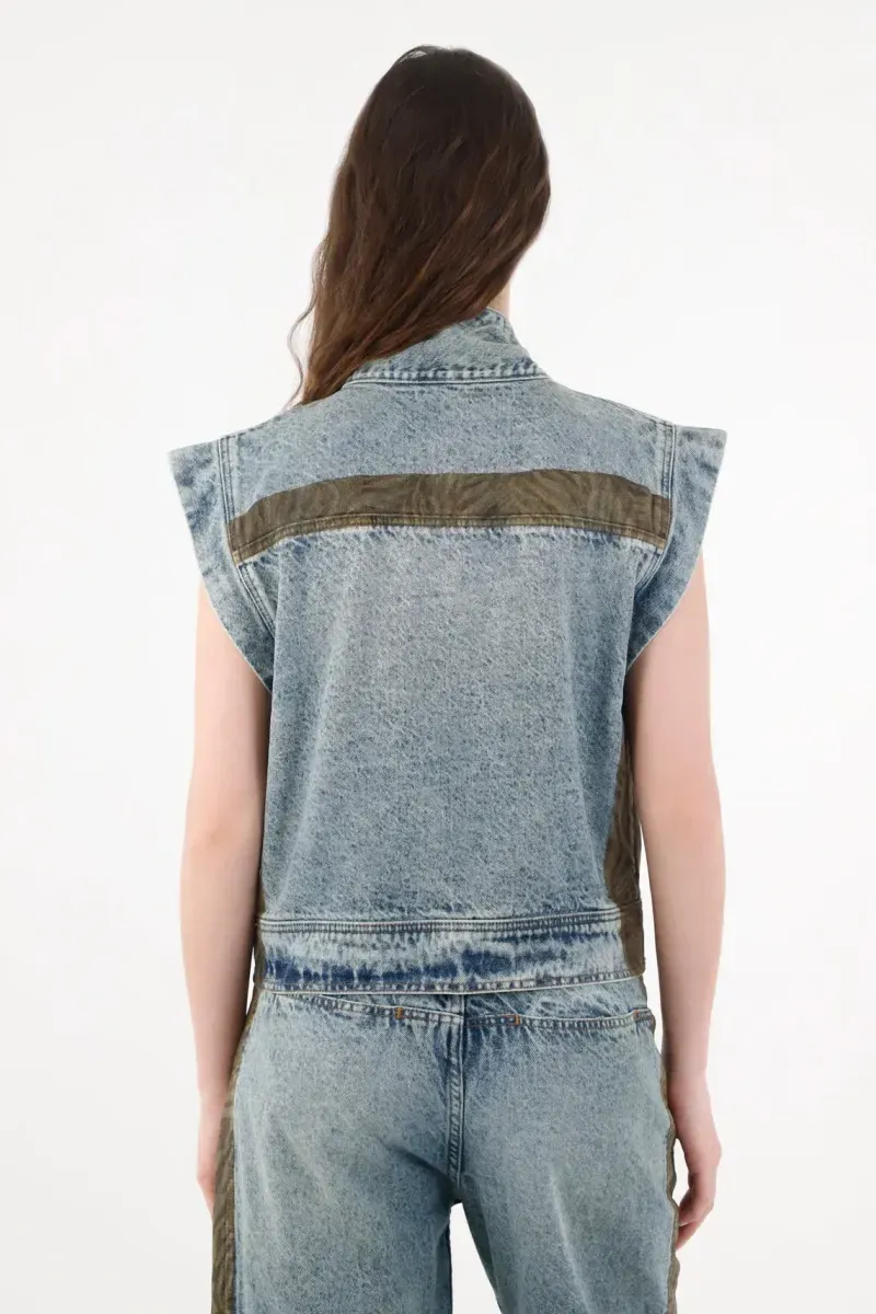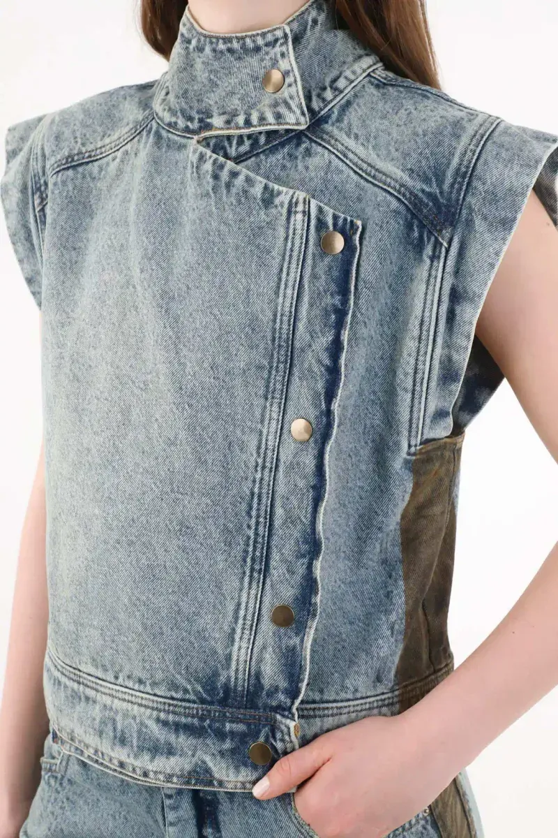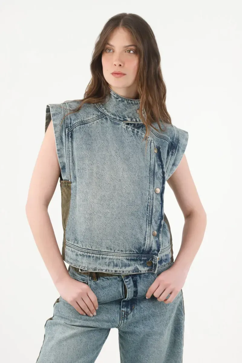Este chaleco de algodón 100% toma el clásico denim y lo actualiza con un cierre lateral de broches metálicos que dibuja una línea diagonal favorecedora y aporta actitud urbana. El lavado azul con efecto marmoleado suma textura visual tipo vintage, fácil de combinar y con carácter propio. El cuello alto le da presencia sin esfuerzo, mientras el fit recto con hombro marcado y sisas amplias deja espacio para moverte cómoda y jugar con capas, manteniendo la estructura limpia que define a TNS.
