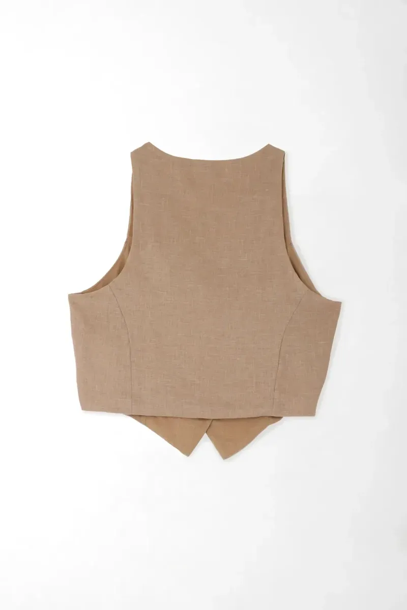 El bajo en doble pico manda. Este chaleco sastrero de lino 100% exterior con forro de algodón abraza la estética limpia de TNS. El escote en V y sus cuatro botones al frente dibujan una línea vertical que estiliza. Las costuras tipo princesa trabajan la silueta para un fit entallado a la cintura, mientras el color arena suma calidez y combina con todo. El resultado: un chaleco de lino para mujer que se siente actual, nítido y con actitud urbana.