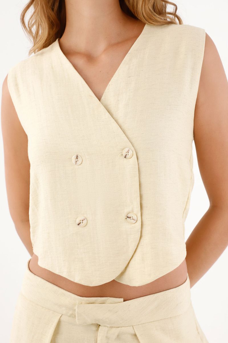 Este chaleco de lino y viscosa en tono beige natural reinterpreta el sastre con un cruce envolvente y doble botonadura que afina visualmente el torso. El escote en V limpia la línea del cuello y alarga la silueta, mientras el bajo curvo y ligeramente corto aporta un toque moderno y femenino. Los botones a tono sellan un acabado minimal acorde al ADN TNS: limpio, urbano y fácil de combinar.