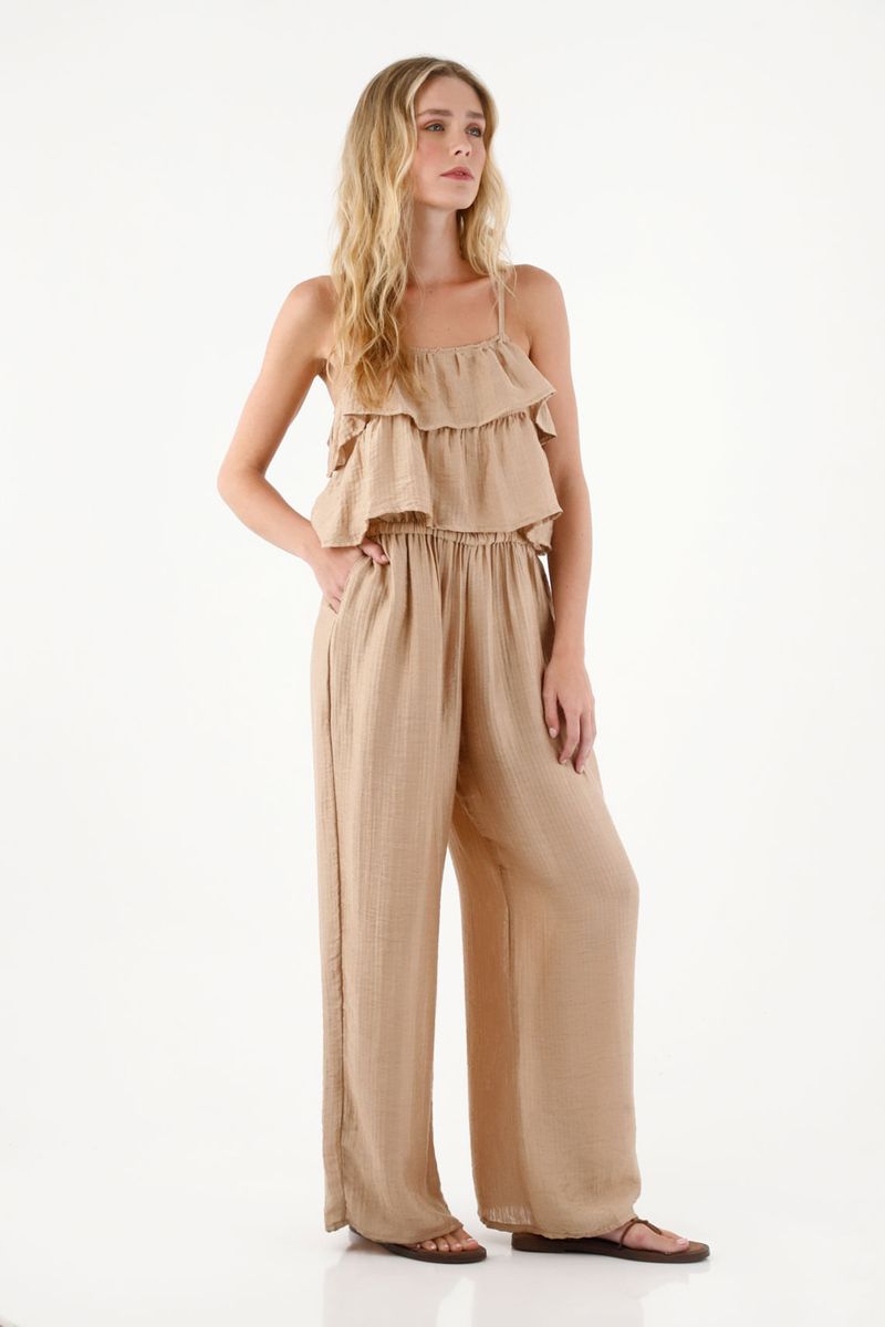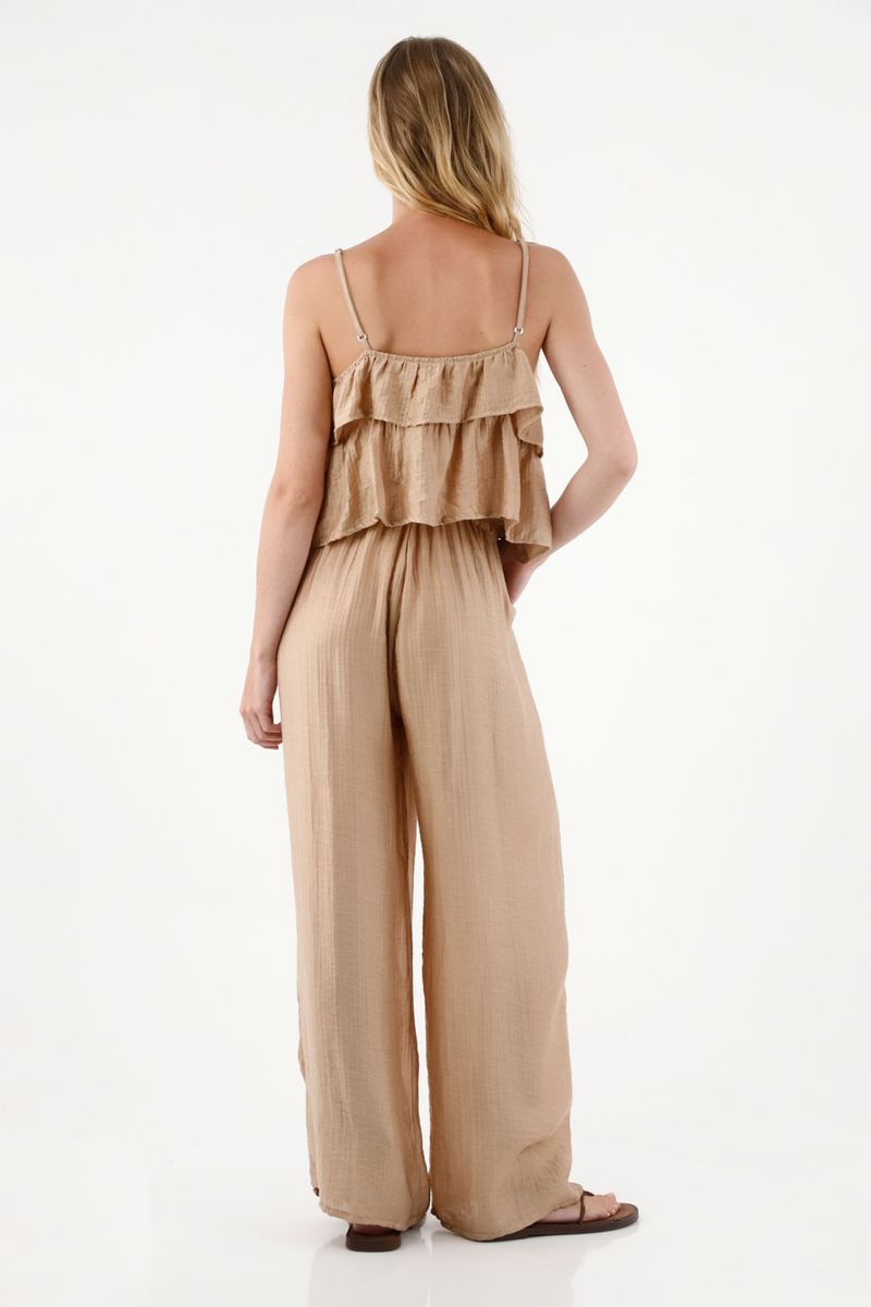 Este all in one está confeccionado en una tela con caída fluida y un sutil brillo, que aporta movimiento, frescura y un toque sofisticado ideal para el día a día o para ocasiones especiales. El escote con boleros añade un aire femenino y delicado, mientras que las tiras ajustables permiten un ajuste personalizado y cómodo. Su diseño se adapta suavemente en la cintura con elástico, definiendo la silueta sin perder amplitud ni libertad. El pantalón de silueta amplia y bota recta complementa la prenda con un estilo moderno y relajado que estiliza y favorece la figura.