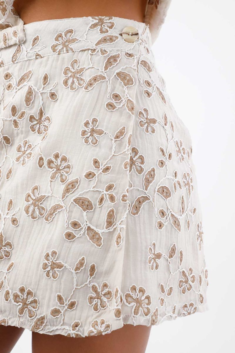 Falda corta para mujer en lyocell marfil fit evasé con calado floral