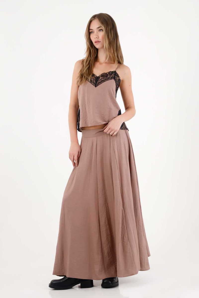 Confeccionada en satín con elástico en cintura trasera y cintura lisa en frente, logrando ajuste cómodo y favorecedor. Su caída fluida y brillanteza natural hacen que cada paso resalte la feminidad de la prenda.