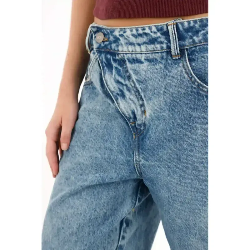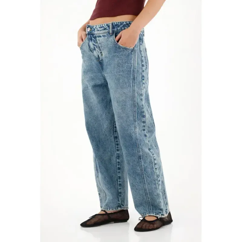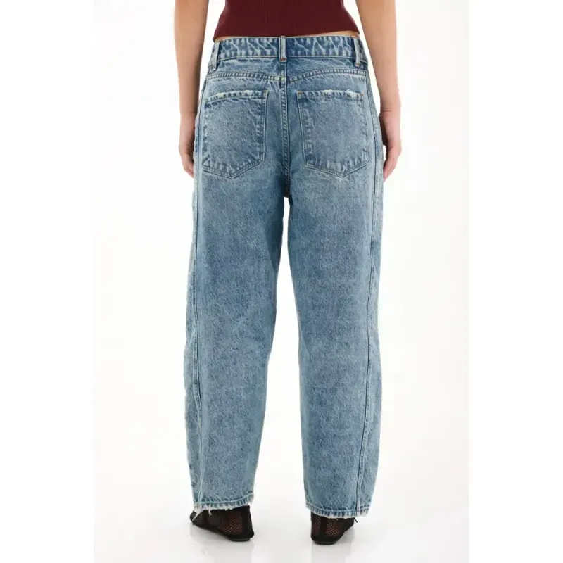 Silueta amplia con curva en bota y cintura baja para un look relajado pero lleno de actitud, el diseño curvo y las pinzas aportan estructura sin perder comodidad.