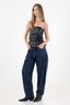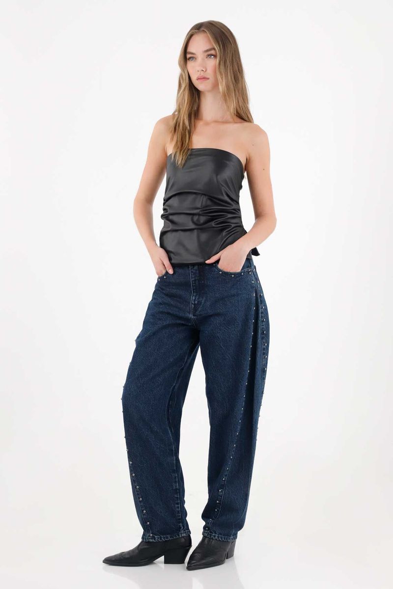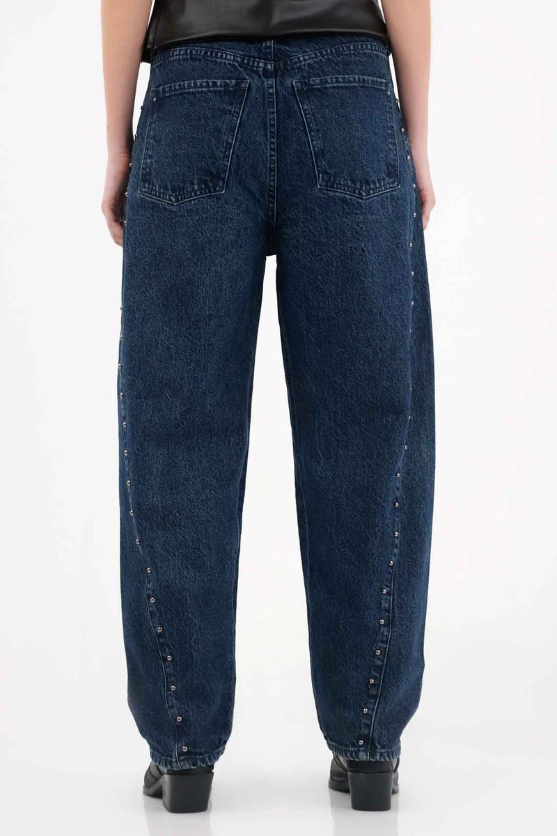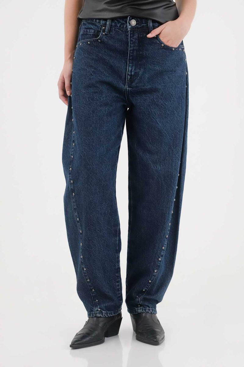 Este mom jean captura la nostalgia de los noventa con un giro moderno: taches que iluminan los cortes delanteros y un azul medio que se adapta a cualquier estilo. Perfecto para looks relajados con camisetas básicas o para elevarlo con una camisa romántica y botas de cuero.