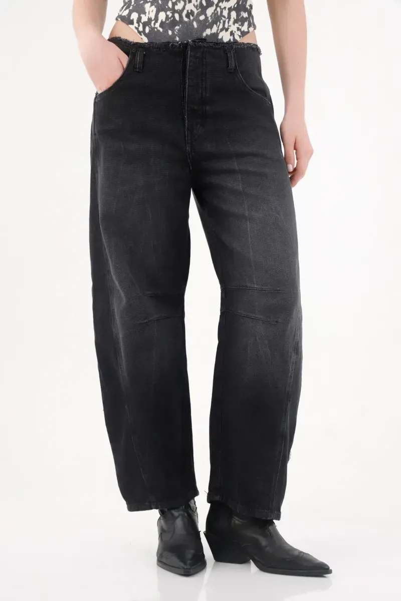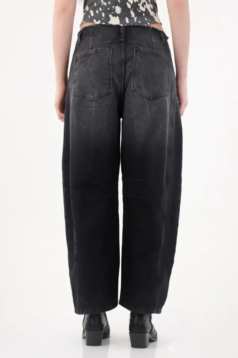 Este jean mujer silueta herradura está confeccionado en denim 100% algodón de peso alto: el tejido rígido mantiene la forma y crea volumen controlado con aire contemporáneo. El tono negro lavado carbón aporta profundidad y combina con todo. La cintura lisa y el tiro medio alto limpian el frente y estilizan; las costuras y pinzas a la altura de la rodilla dibujan la pierna curva para una caída fluida sin perder definición. Resultado: un jean de pierna curva que suma actitud, comodidad y una identidad urbana muy TNS.