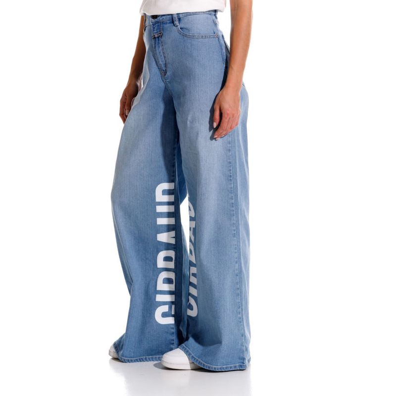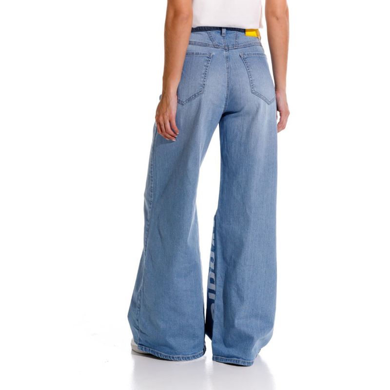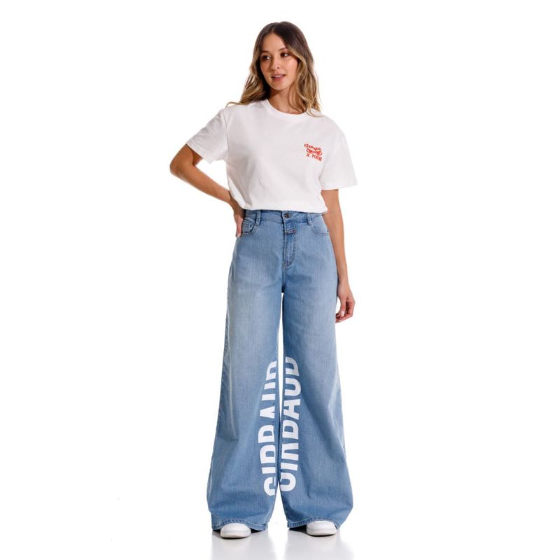 Jean tiro alto cinco bolsillos. Efecto lavado azul medio. Estampado en delantero
