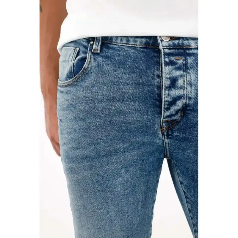 Diseñado en 99% algodón y 1% elastano, en denim lavado medio con efecto toalla, realce en costuras y arrugas 3D que refuerzan su carácter.