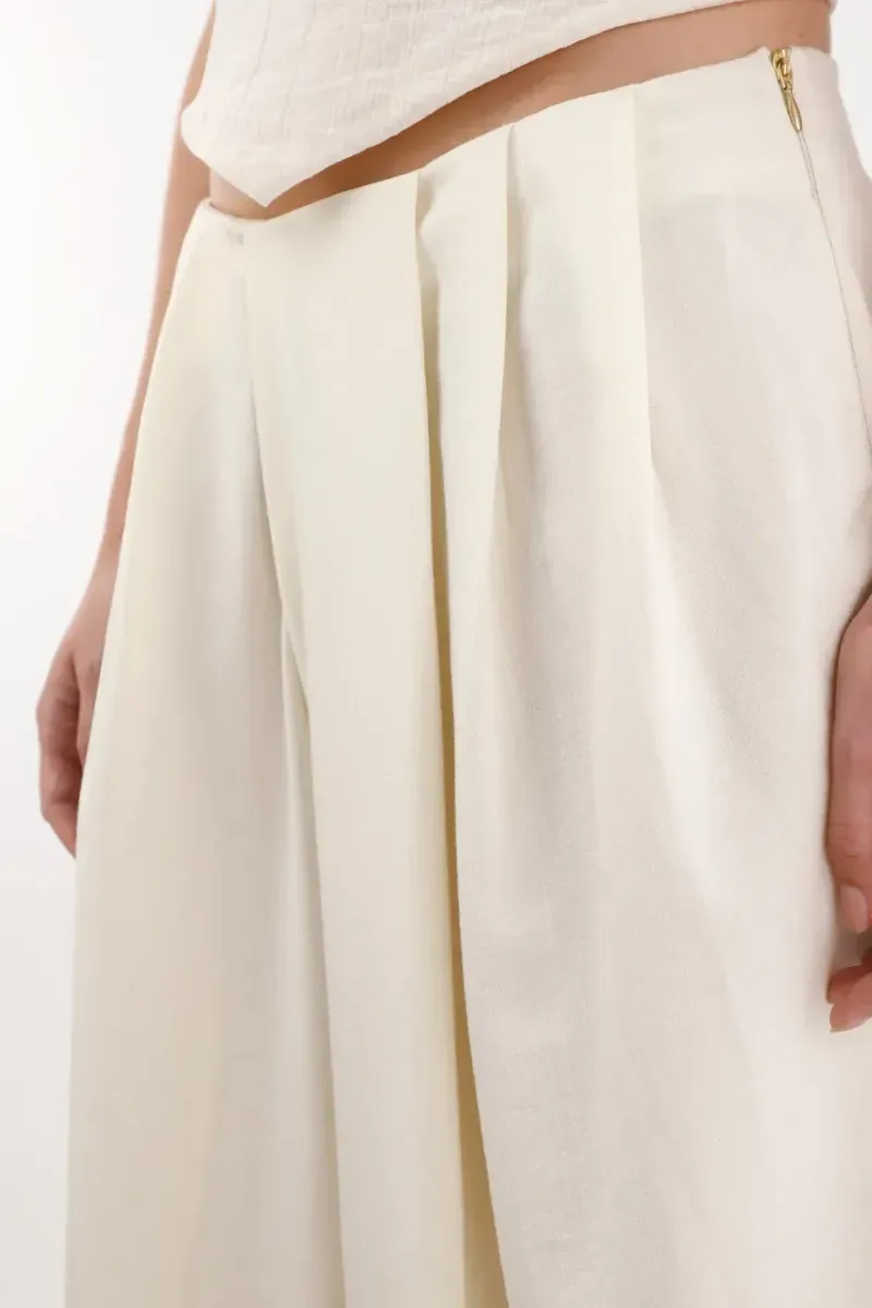 Confeccionado en mezcla de viscosa y poliéster que aporta estructura sin perder movimiento. Pretina cruzada y prenses delanteros que suman detalle y sofisticación.